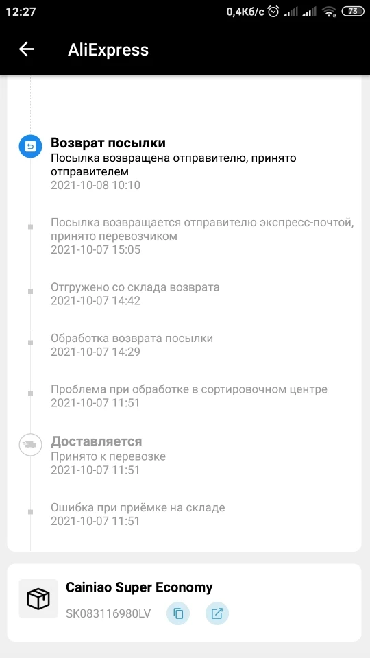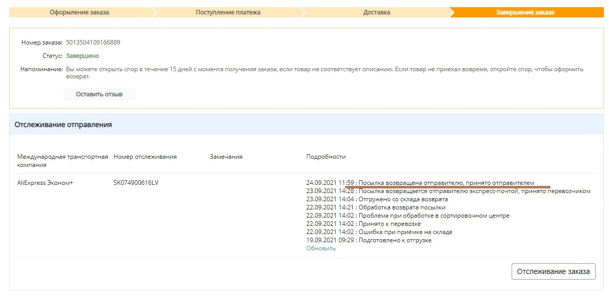 Товар развернули еще в Китае, вернулся назад отправителю, отправитель забрал посылку назад. Открыл спор, со скринами, что товар вернули отправителю. Продавец отписал какую-то херню, типа жди терпеливо, в итоге я не заметил даже когда заказ успешно закрылся. The goods were deployed back in China, returned back to the sender, the sender took the package back. Opened a dispute, with screenshots that the goods were returned to the sender. The seller unsubscribed some garbage, like wait patiently, in the end I didn't even notice when the order was successfully closed.
