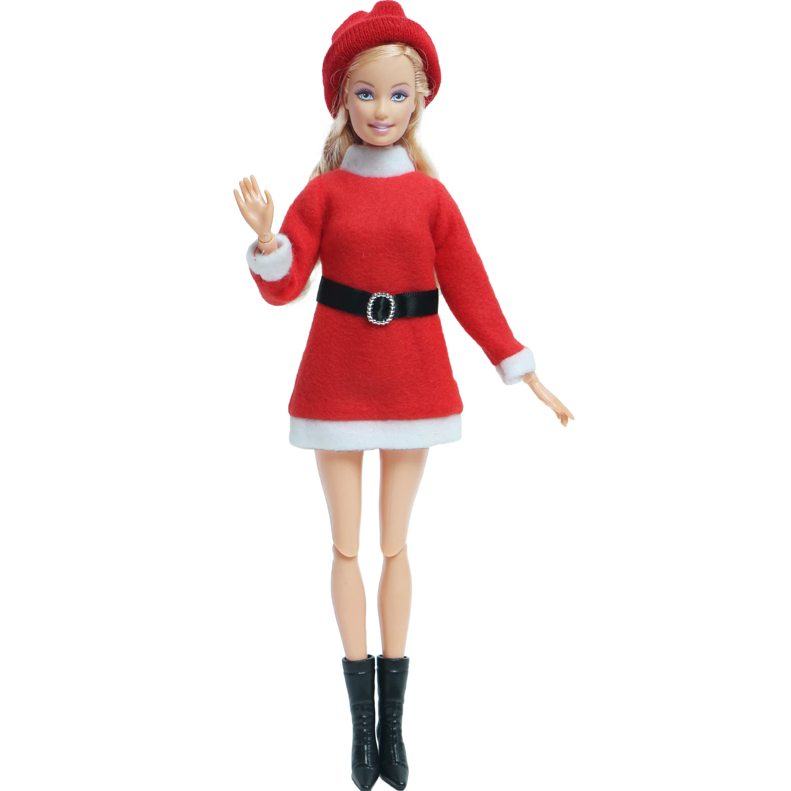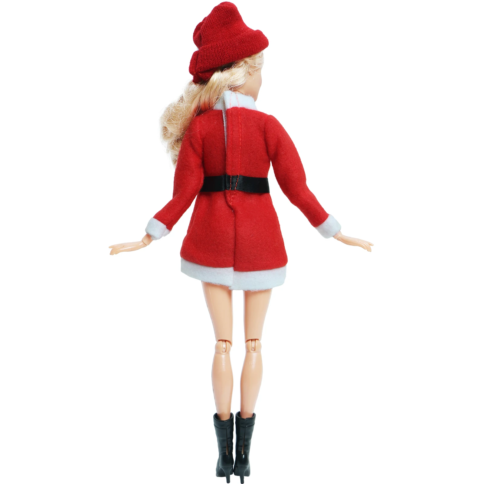 Один комплект, красное платье с длинным рукавом, зимняя одежда, шляпа, ботинки, пояс, аксессуары, Рождественская одежда, Одежда для куклы Барби, детские игрушки сделай сам