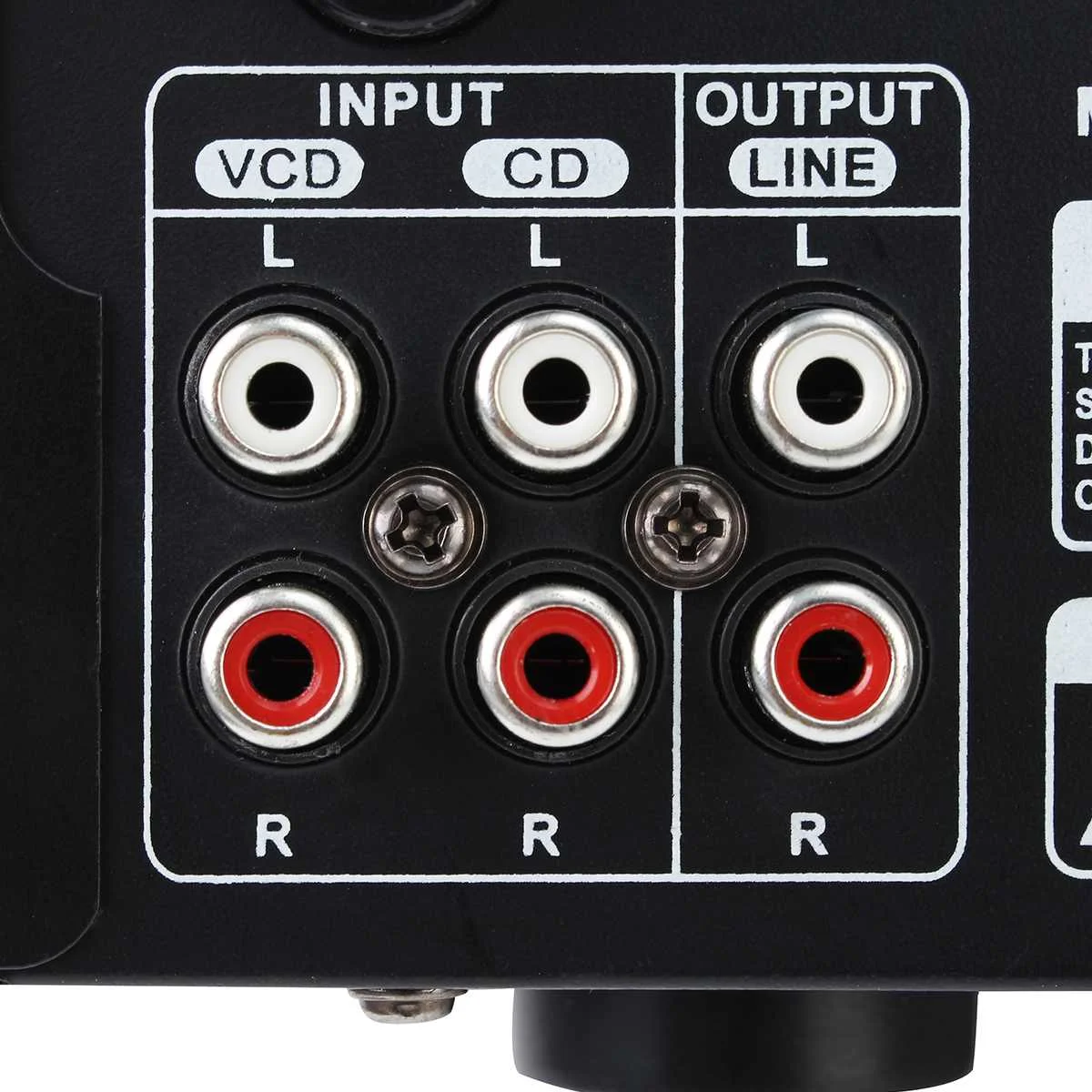 Спецификация:1. Функция: Bluetooth прием/вставка u-диска/дистанционное управление/fm-радио/функция Cara OK с реверберацией2. Номинальное сопротивление: от 4 до 8 Ом3.RMS: 100 Вт + 100 Вт рекомендует громкоговоритель с динамиками менее 8 дюймов4. Пиковая мощность: 250 Вт + 250 Вт5. Источник питания: постоянный ток: 12 В ≥ 5A. Переменный ток: 110 В6. Канал: 2 канала7. Аудиовход: усилитель мощности сзади AUX lotus seat многоканальный вход сигнала, можно подключить: компьютер/MP3/DVD/CD и другие аудиосигналы,8. Аудио выход: 4 зерновой терминал Колонка L, левая + R правый канал вывода точек, положительных и отрицательных полюсов подключены к динамику.9. Размер: 25*21*7 см