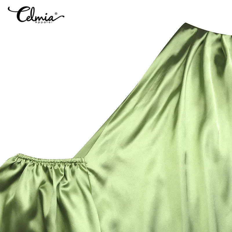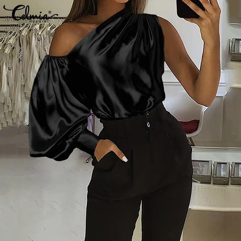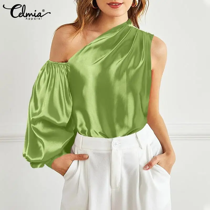 2021 Celmia женские атласные топы с рукавами-фонариками, летняя блузка на одно плечо, асимметричные повседневные рубашки, модные глянцевые Блузы