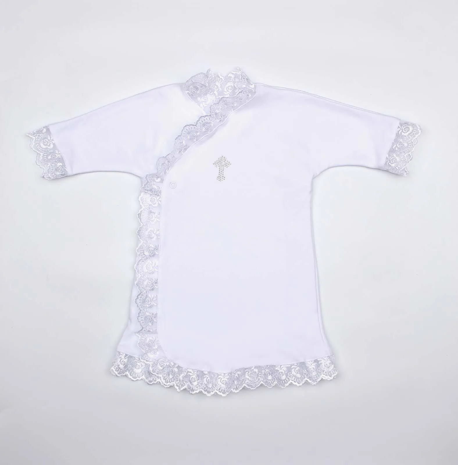 Крестильная рубашка для мальчика из интерлока, обшита кружевом с термоаппликацией в виде креста из страз. Состав 100% хлопок