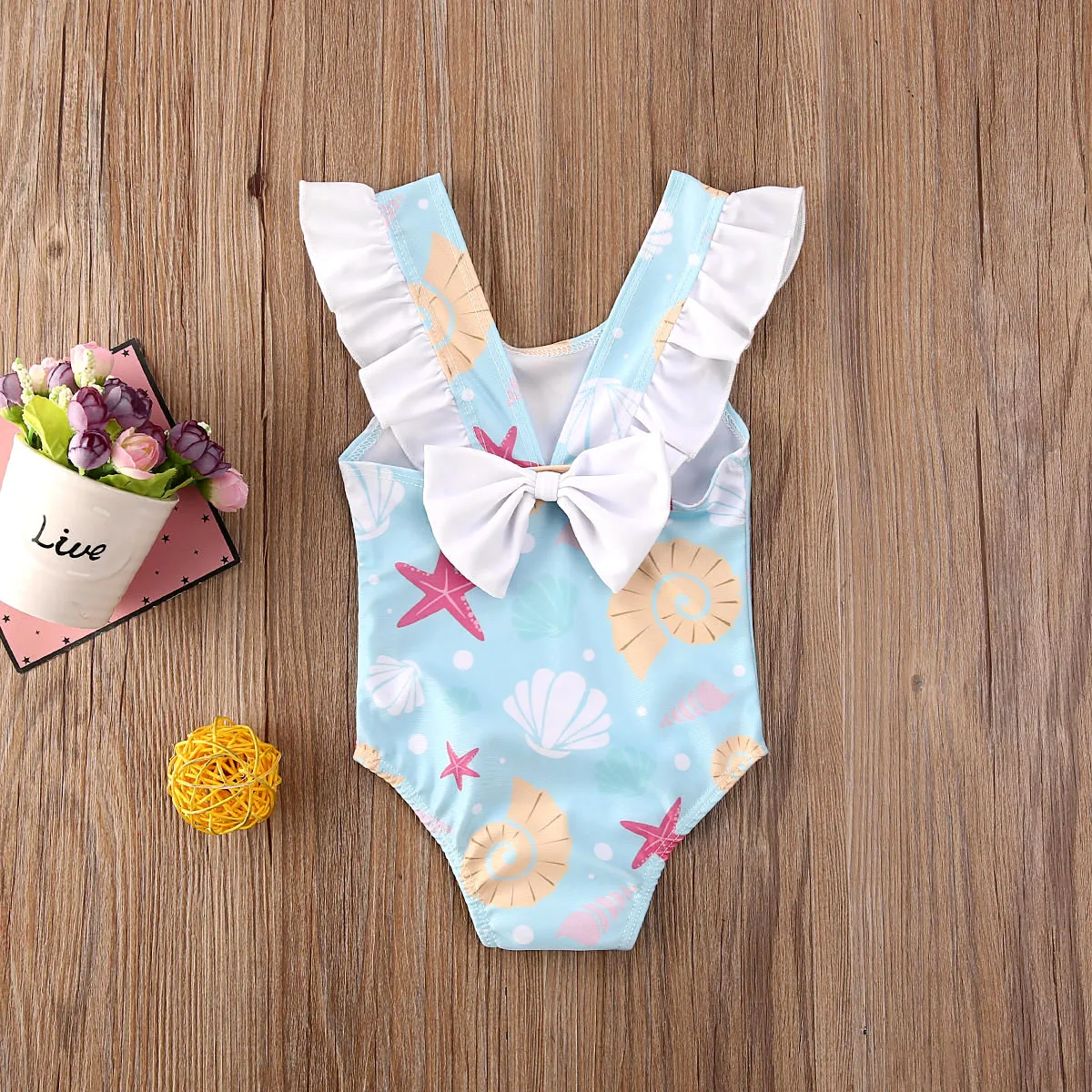Купальник для девочек 0-3 лет, милый купальник с бантом, оборками, ракушками, морскими звездами, принтом, летняя одежда для купания для маленьких девочек