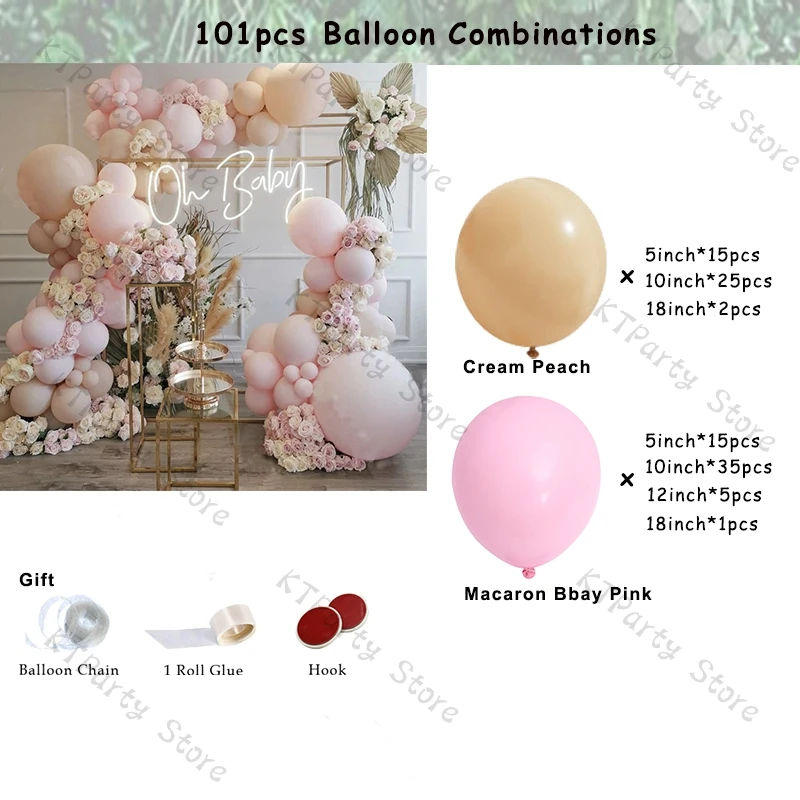 101 шт. набор воздушных шаров:Macaron Bbay Pink(5 дюймов * 15 шт., 10 дюймов * 35 шт., 12 дюймов * 5 шт., 18 дюймов * 1 шт.)Кремовый персик (5 дюймов * 15 шт., 10 дюймов * 25 шт., 18 дюймов * 2 шт.)Бесплатно для вас:Рулон глюе1 (100 шт)Воздушный шар 1(5 м)Крючок * 3