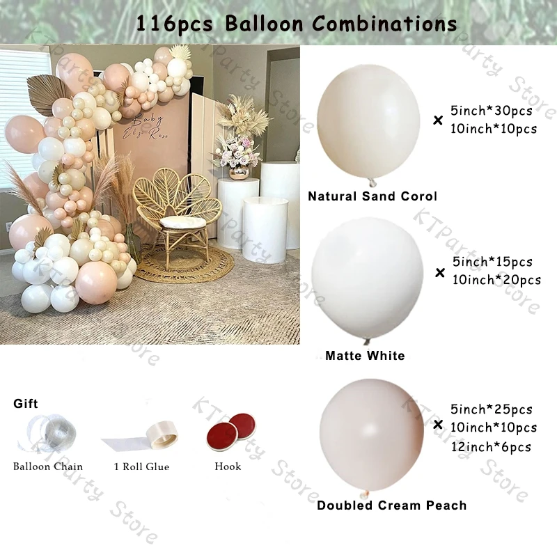 116 шт. набор воздушных шаров:Натуральный песочный корол (5 дюймов * 30 шт., 10 дюймов * 10 шт.)Матовый белый (5 дюймов * 15 шт., 10 дюймов * 20 шт.)Крем-персик в два раза (5 дюймов * 25 шт. 10 дюймов * 10 шт., 12 дюймов * 6 шт.)Бесплатно для вас:Рулон глюе1 (100 шт)Воздушный шар 1(5 м)Крючок * 3
