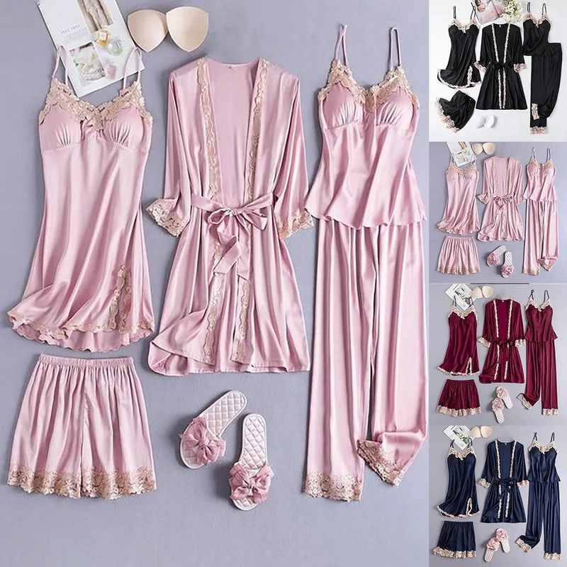 Пижамный комплект из 5 предметов, повседневная одежда для сна для женщин, атласная кружевная ночная рубашка в стиле пэчворк, весна-осень, домашняя новая Пижама