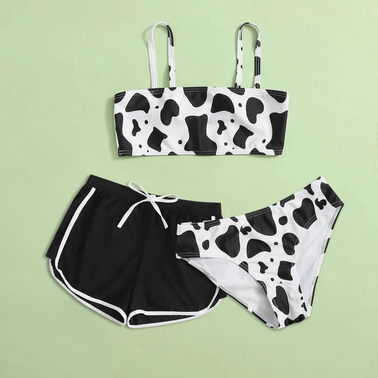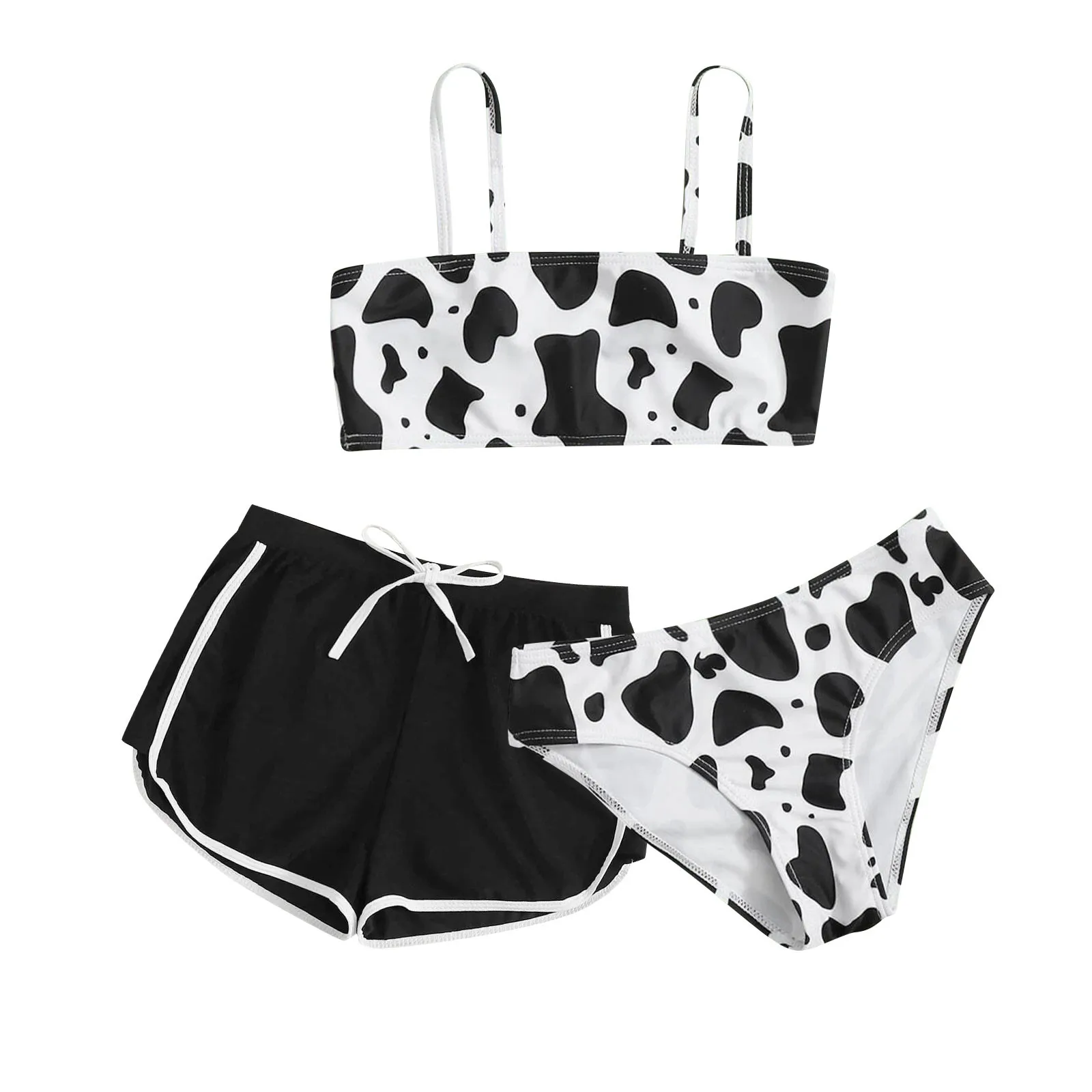 От 8 до 14 лет новые купальники для маленьких девочек 2021, летние милые купальники из трех предметов с коровьим цветочным принтом и перекрестной спиной
