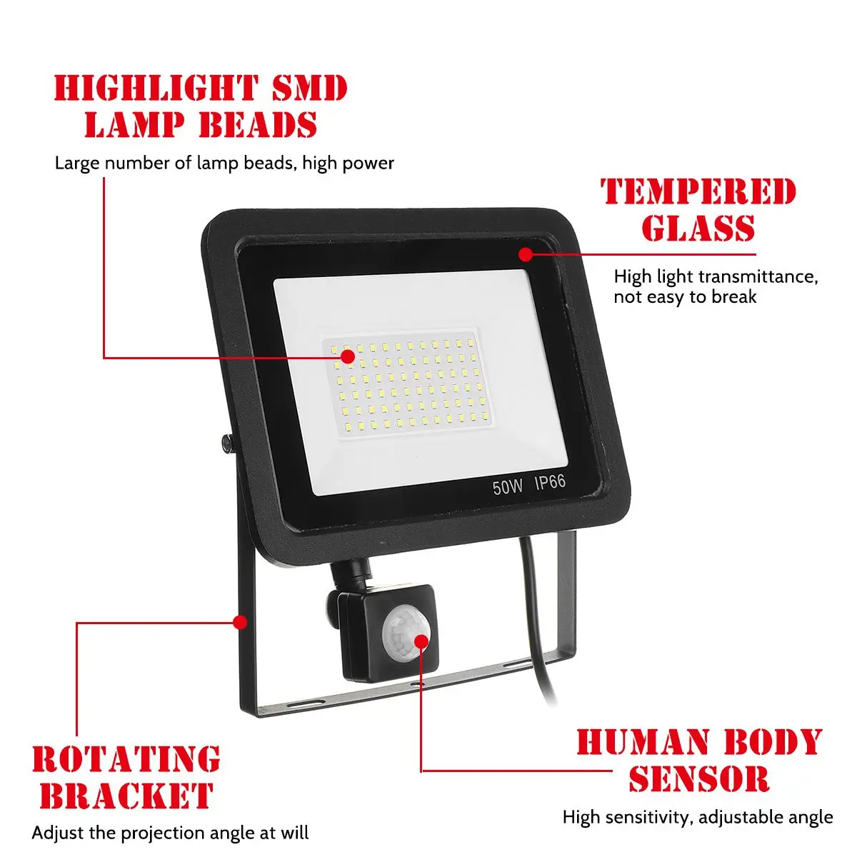 Спецификация:Название продукта: прожекторыРазмер: 20,5х20, 5 см/8х8 дюймовЦвет корпуса: черный/белыйМатериал: алюминий, АБС-пластик, стеклоМощность: 10 Вт/20 Вт/30 Вт/50 Вт/100 ВтСветильник источник света: светодиодныйIP Рейтинг: IP66Светодиодный чип: SMD 2835Цветовая температура: белый: 6500K