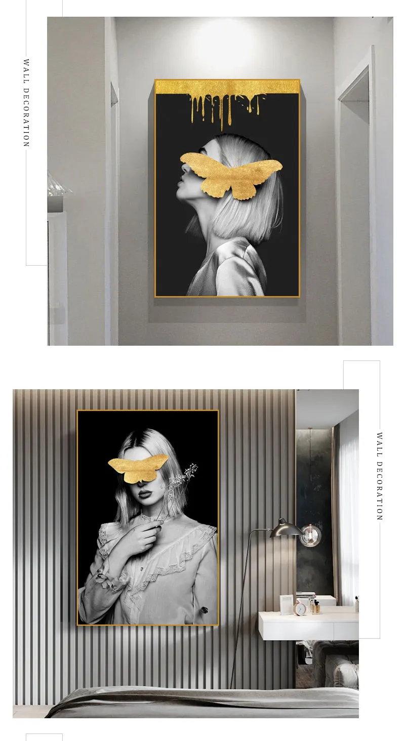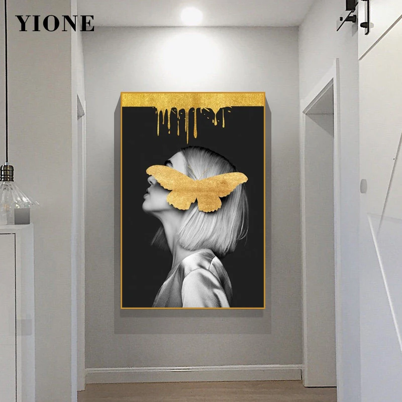 Современная черно-белая женщина с желтой бабочкой, холст, картины, абстрактная фигурка, настенный плакат, картина, принты, домашний декор