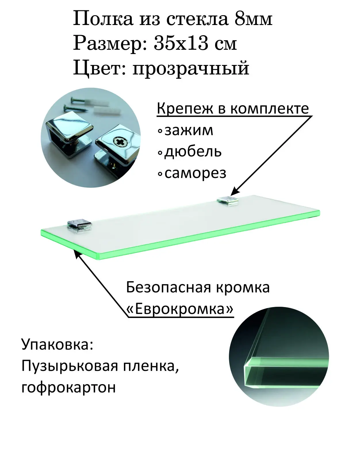 Полка стеклянная Glass&Master 8 мм цвет прозрачный 35*13см, с безопасной кромкой (трапеция), зажимается двумя креплениями которые поставляется в комплекте вместе с полкой. Монтаж полки простой: сверлится отверстие в стене устанавливается, два крепежа в которые вставляется полка и затягивается винтами. Крепеж и полка выполнены из влагостойкого материала неподдающиеся коррозии. Полка из стекла с хромированным крепежом идеально вписывается в любой интерьер дома или офиса. Полка надежно упакована в пузырьковую пленку и гофрокартон. Дюбеля и саморезы в комплекте.