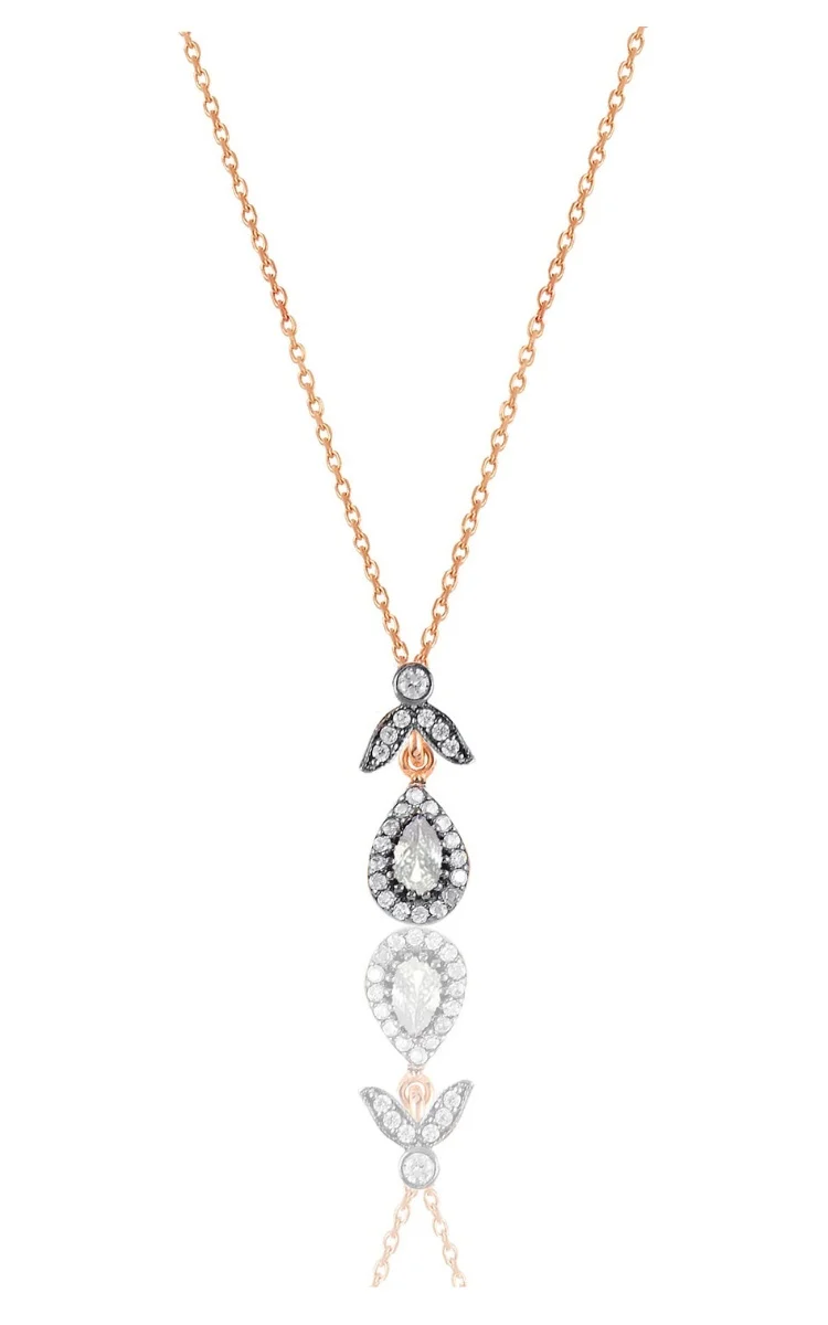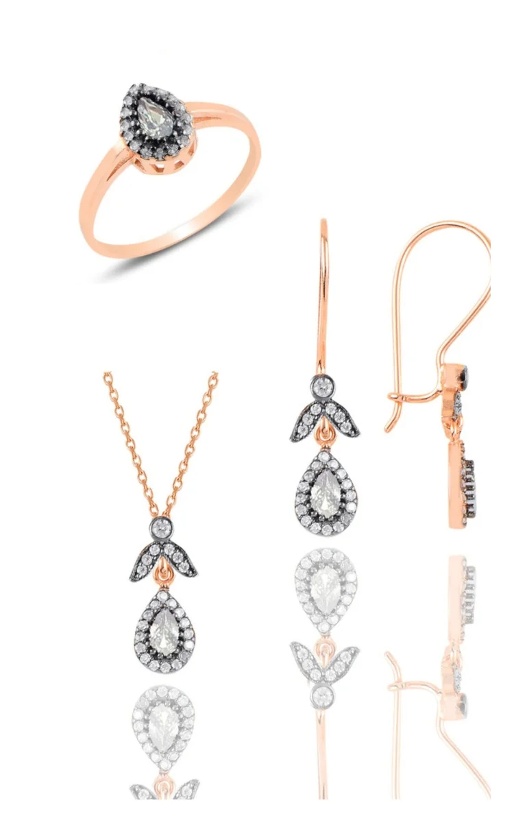 925 пробы набор из серебра и розового циркония с фианитами и бриллиантами. Кольцевая часть 9 мм x 7 мм. Серьги yukardan down 34 мм. Подвеска 17 мм x 7 мм. Цепочка 42 см + 4 см удлинение Вес: 5,7 г