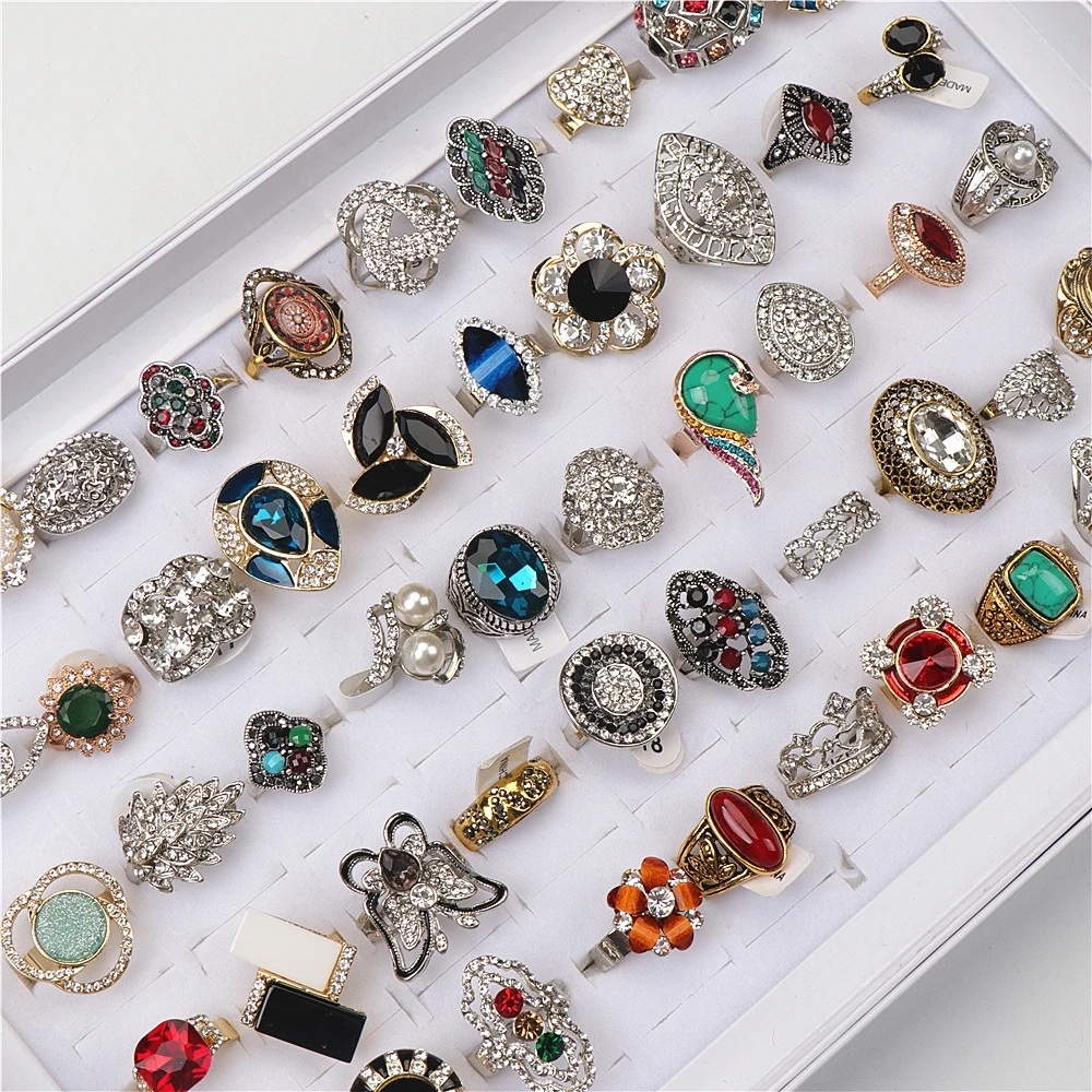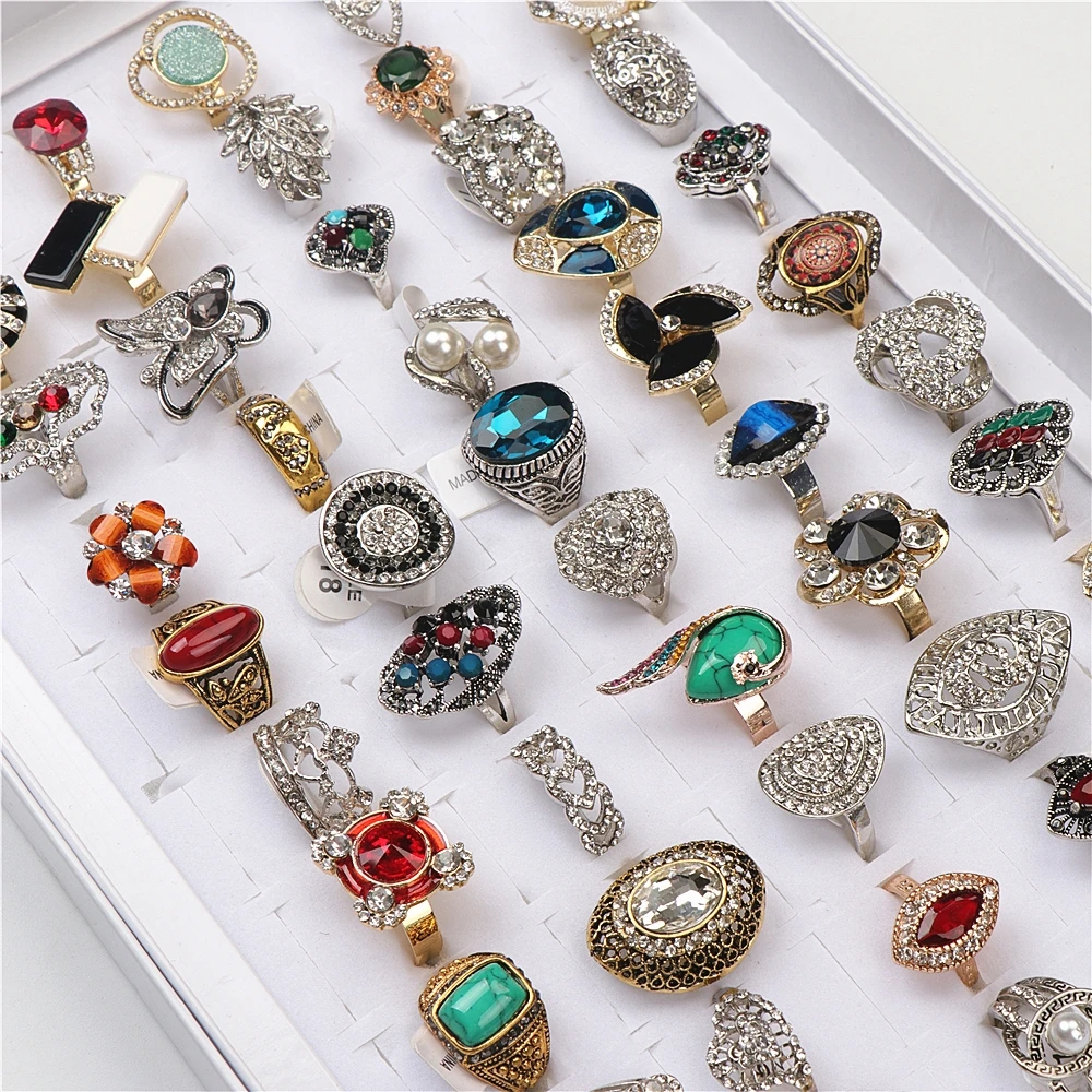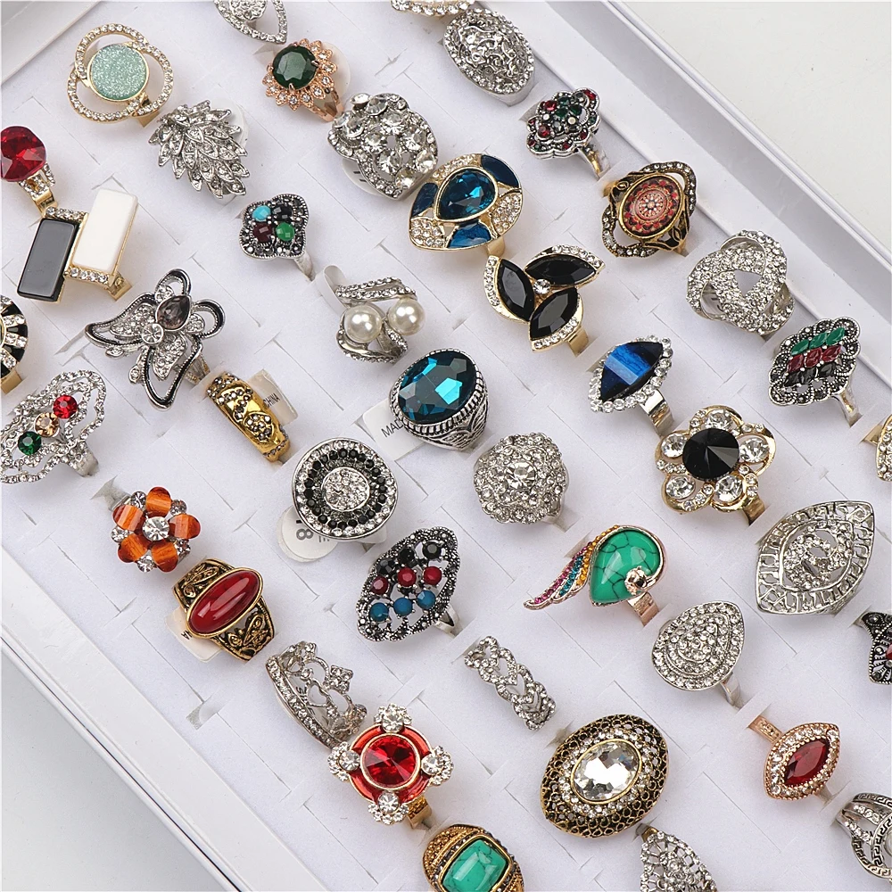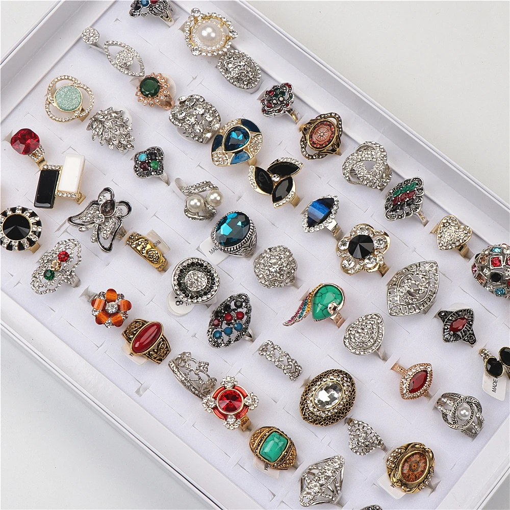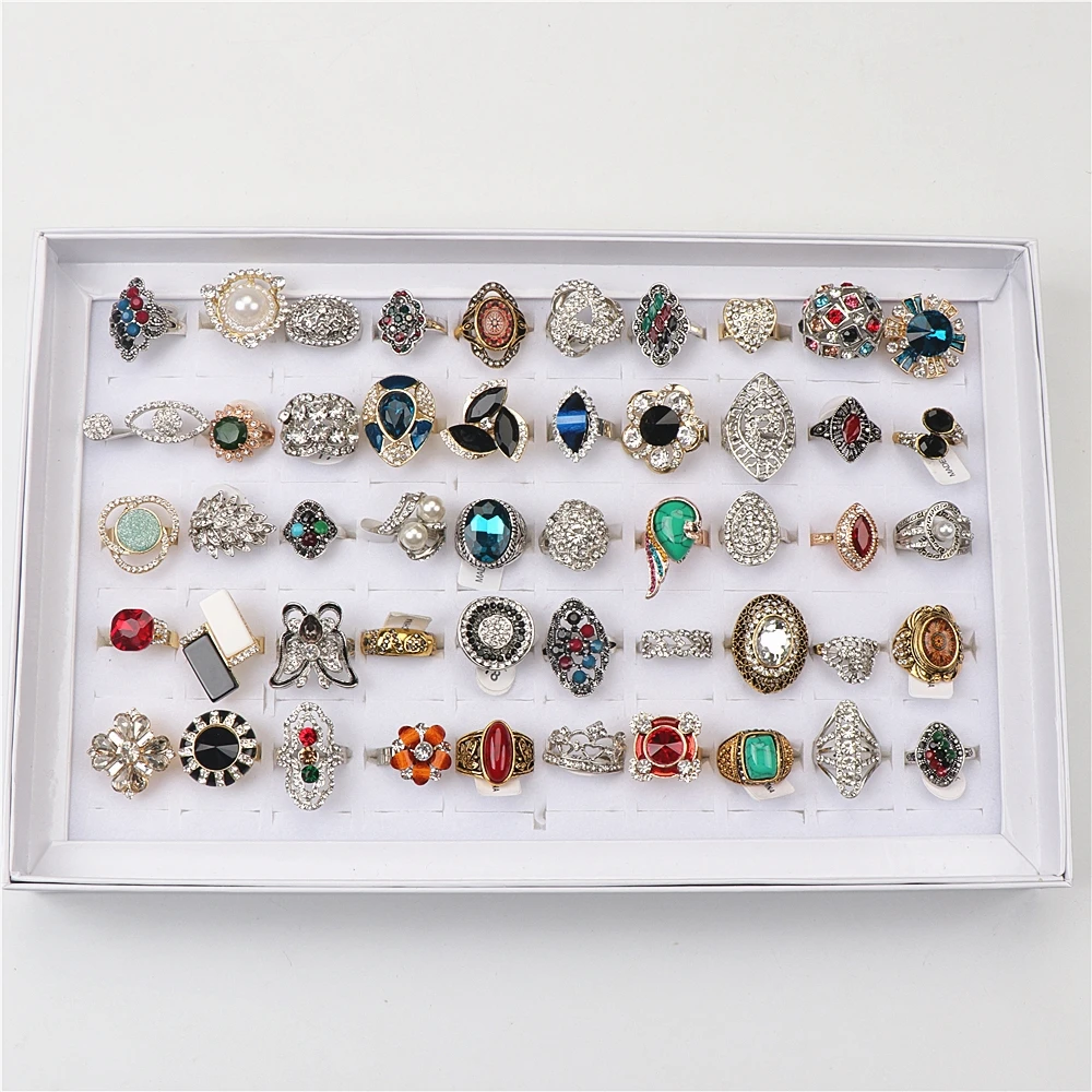 50 шт.лот винтажные разноцветные металлические кольца со стразами для женщин модные ювелирные изделия с коробкой смешанные стильные подарки для вечеринок оптовая продажа