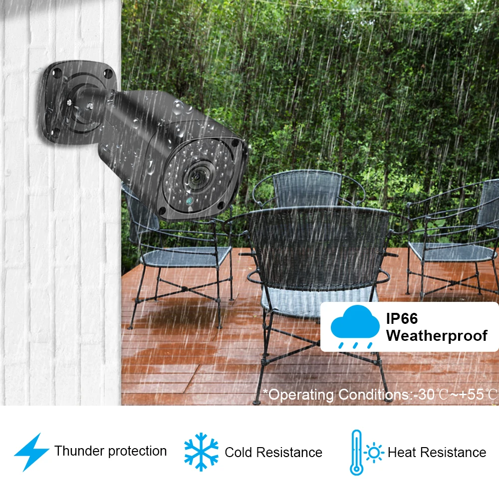Используйте их в качестве наружных камер или внутренних камер, так как они созданы жесткоВыдерживает любую погоду: дождь, снег, пыль и жаркие дни.С защитой от атмосферных воздействий IP66 и кабелями, продетыми через подставкуЗащита, убедитесь, что вы можете ответить на их производительность, день и день.Наша камера имеет сверхпрочный металлический корпус, профессиональный IP66, устойчивый к атмосферным воздействиям, обеспечивая стабильную производительность как внутри, так и снаружи.