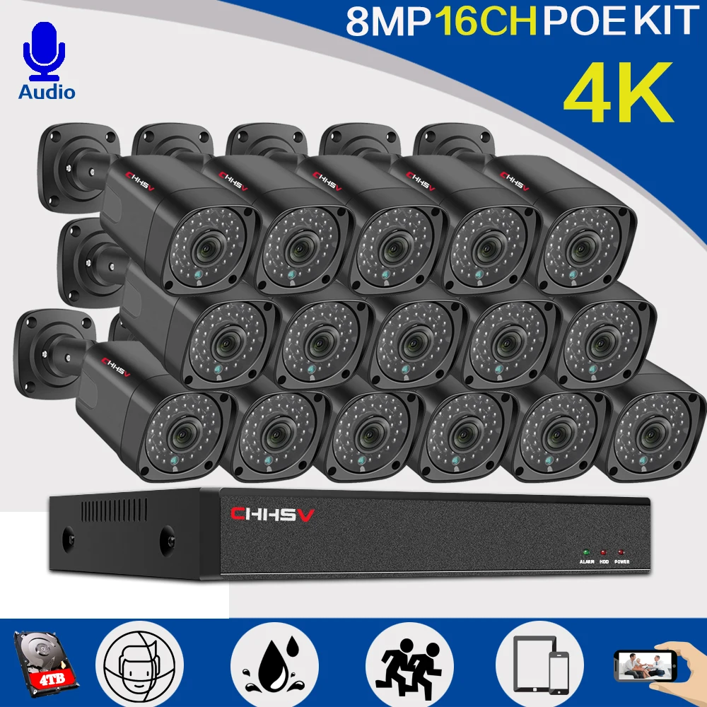 Система видеонаблюдения POE 4K Ultra HD, 16-канальный сетевой видеорегистратор POE, 8 Мп наружная Водонепроницаемая фотокамера, s H.265, комплект видеонаблюдения