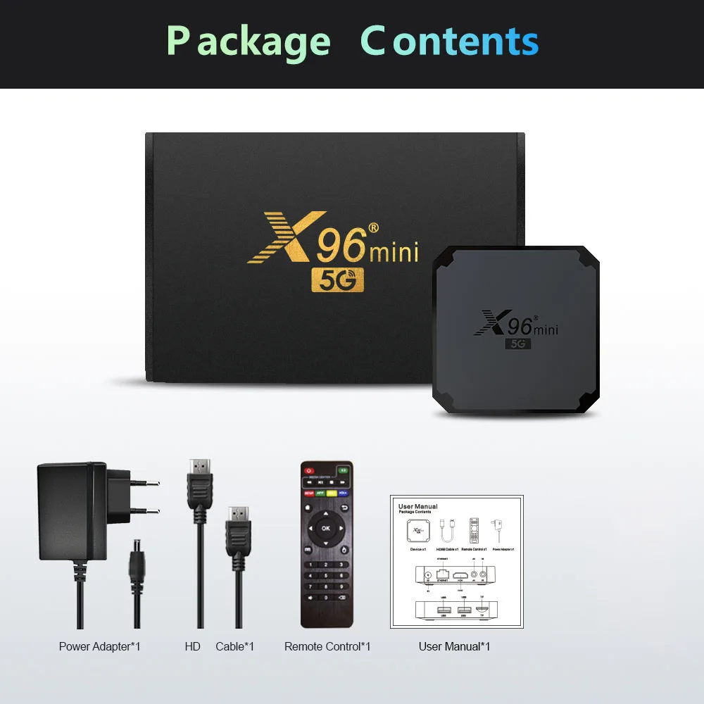 -Руководство пользователя * 1-ТВ-приставка X96MINI5G * 1-Пульт дистанционного управления * 1-Кабель для передачи данных HD * 1-Адаптер питания * 1