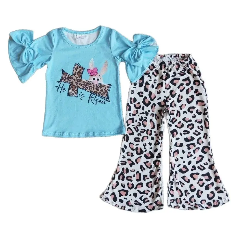 Оптовая продажа, Пасхальный кролик, детский весенний наряд с голубым бантом и оборками, одежда для маленьких девочек, леопардовые брюки, одежда для малышей