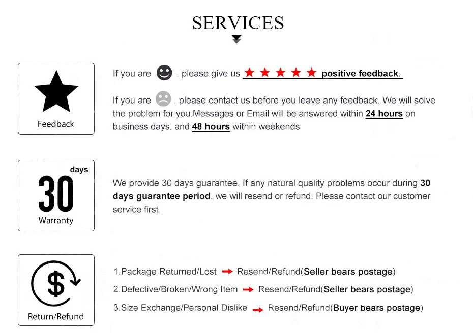 5. Мы стремимся к совершенству с высокими стандартами и стремимся к 100% удовлетворенности клиентов. Ваши отзывы очень важны для нас. Если вы остались довольны нашими товарами, то, пожалуйста, поставьте нам 5 звезд в Отзывы и дайте нам хороший отзыв, спасибо большое!