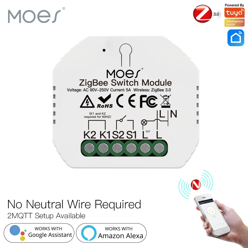Модуль переключателя света Moes 2MQTT Tuya ZigBee, не требует нейтрального провода, работает с приложением Alexa Google Home