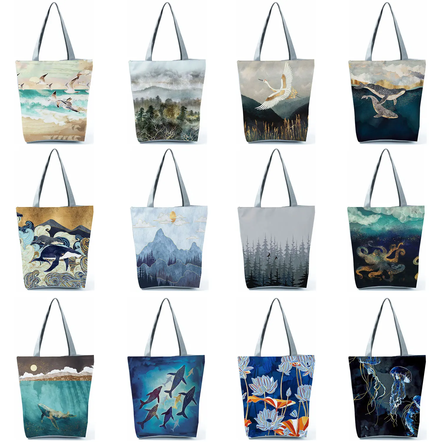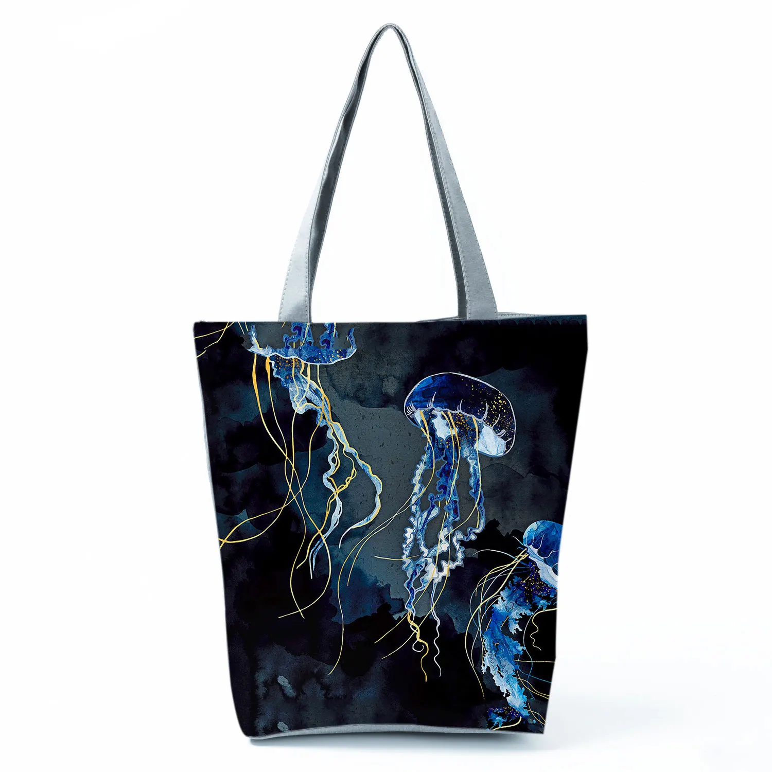 Японская дизайнерская сумка Ukiyo, синяя сумка через плечо с принтом медузы, Экологичная пляжная сумка, вместительная сумка для покупок, модная сумка-тоут