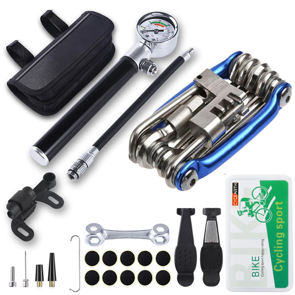 Набор инструментов для ремонта велосипедных шин 210 фунтов на кв. дюйм, мини-насос, многофункциональный инструмент 11 в 1 (с выключателем цепи), пластырь для шин, гаечный ключ, Портативная сумка