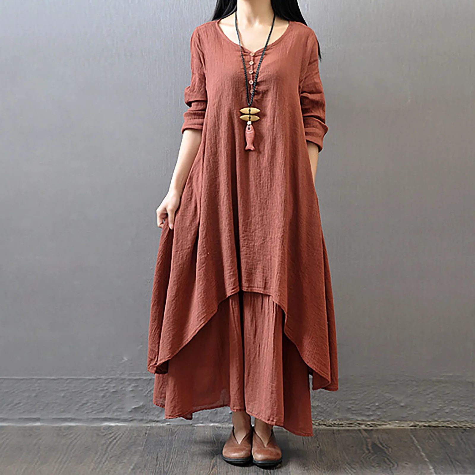 Женские Летние льняные двухслойные Асимметричные Макси-платья с круглым вырезом и пуговицами