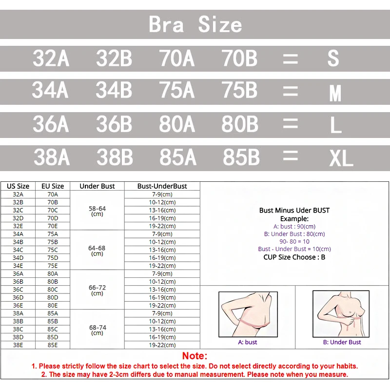 Посылка включает: один бюстгальтерЦвет: 3 цвета sРазмер: 70 75 80 85Пол: женщинВнимание:1. Цвет может немного отличаться из-за разных настроек экрана2: возможны отклонения на 1-2 см при ручном измерении.3: все размеры соответствуют азиатским размерам, а не американским/европейским размерам, они будут на 1-2 размера меньше4: единица измерения: см, 1 дюйм = 2,54 см