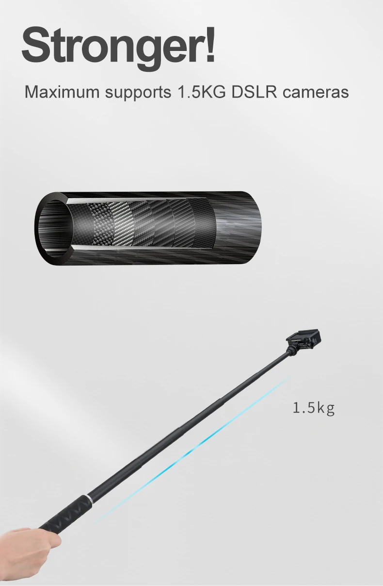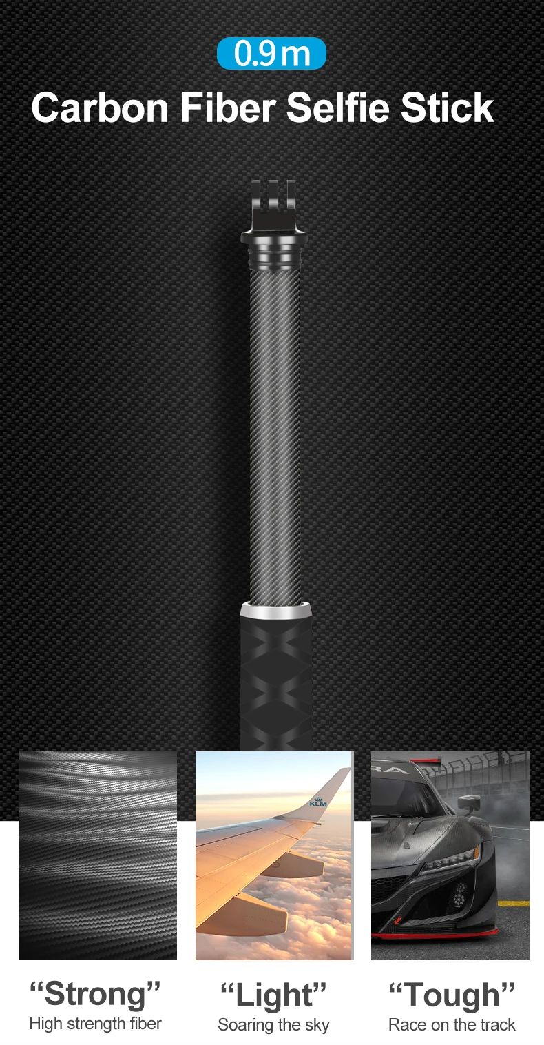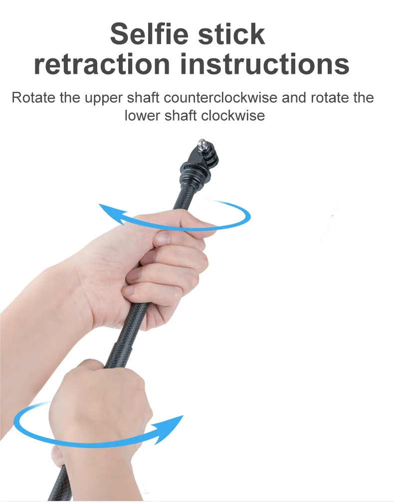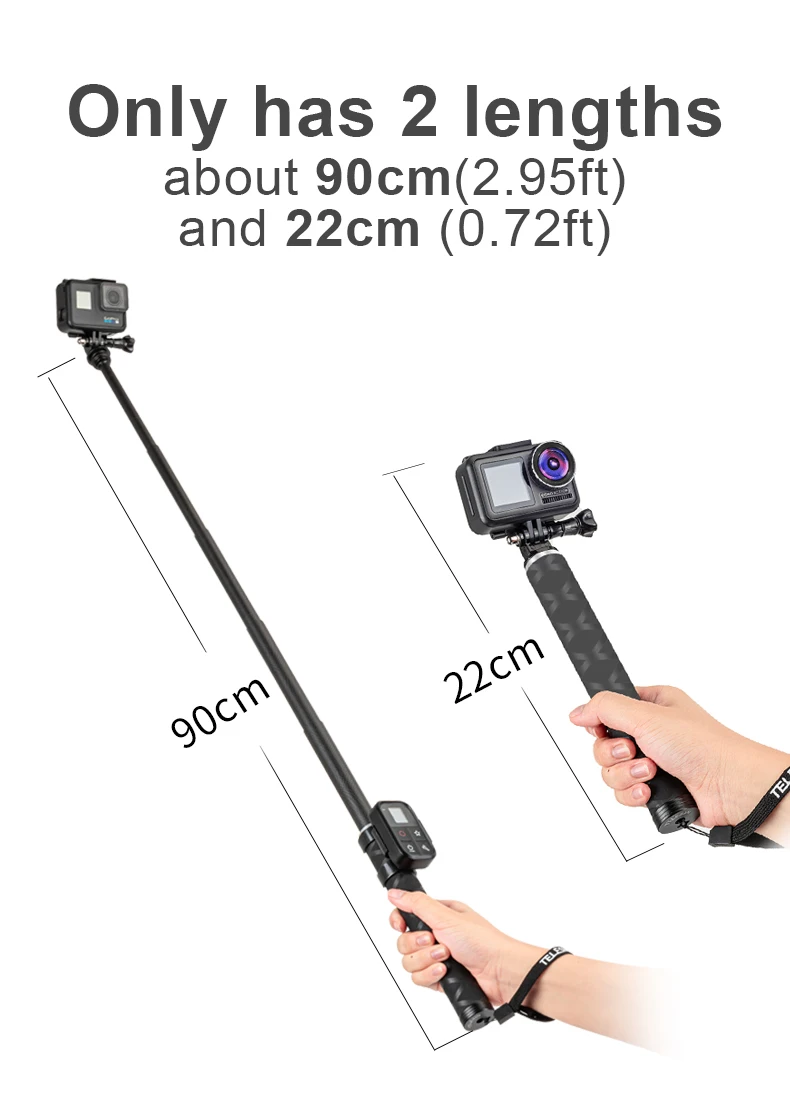 1. Ударопрочный, импорт из Японии, 120T углеродной ткани, поддержка 1,5 кг SLR камеры, не являются безопасными и стабильными.2. Вес всего 113 г, он легче, чем Gopro Hero 7, на одну третью легче, чем традиционные селфи-палки.3. Более прочный, антикоррозийный, может использоваться в море (обратите внимание на чистоту после использования).4. Может использоваться с штативом, замком дистанционного управления, зажимом на мобильный телефон.5. Подходит для GoPro, DJI Osmo Action, Xiaoyi, SJCAM и т. д.6. Штатив из алюминиевого сплава может складываться7. Термоусадочный метод селфи-палки: поверните верхний вал против часовой стрелки и поверните нижний вал по часовой стрелке.8. Обратите внимание: он имеет только 2 длины: 90 см (2,95 фута),22 см (0,72 фута)