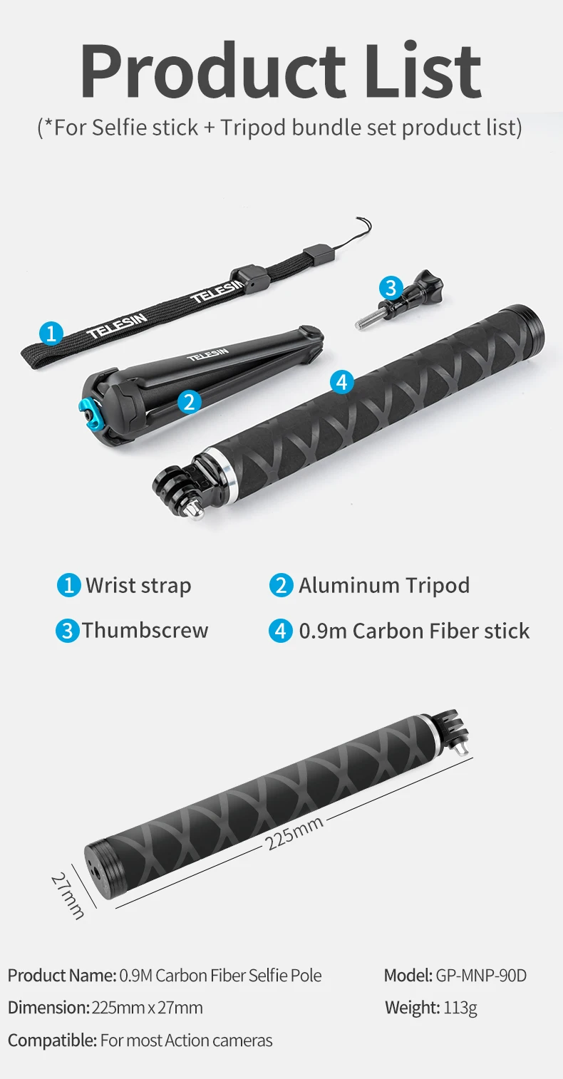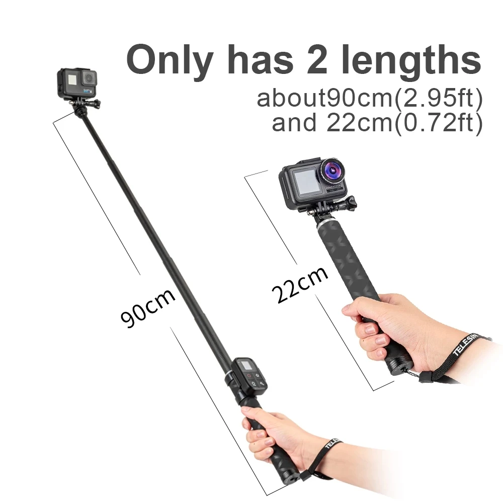 TELESIN 90 см углеродное волокно самая легкая селфи-палка из алюминиевого сплава Штатив для GoPro Hero 10 9 8 7 6 Insta360 DJI Osmo Экшн-камера