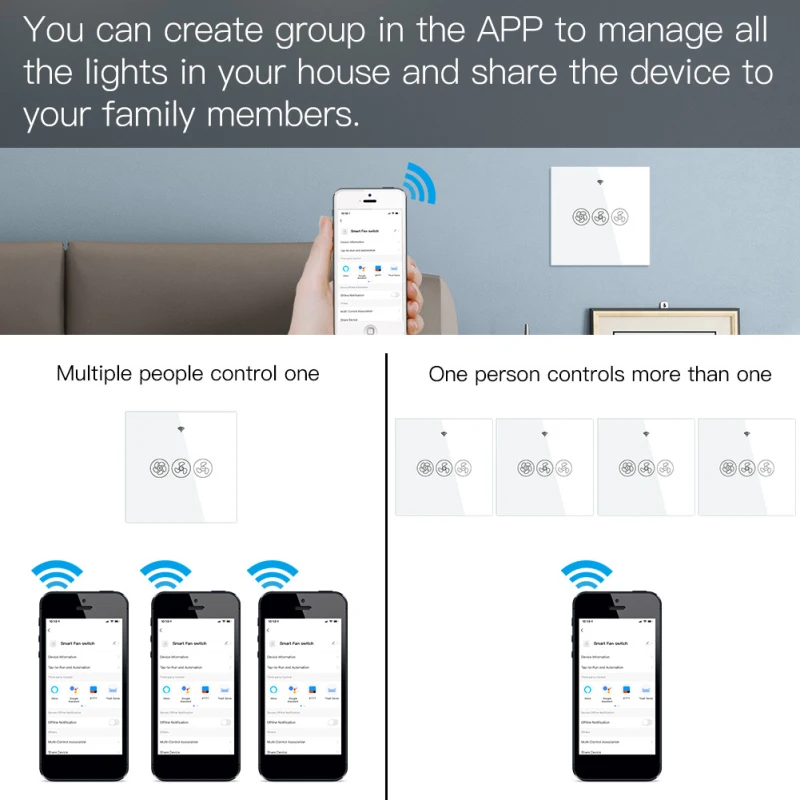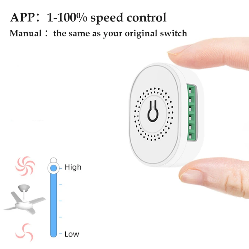 Поддержка мобильного телефона приложение для управления скоростью вентилятора (Поддержка 1-100% процентного контроля скорости), и может быть помещен в коробки переключателей вентилятора (поддерживает оригинальный метод регулировки скорости переключателя),