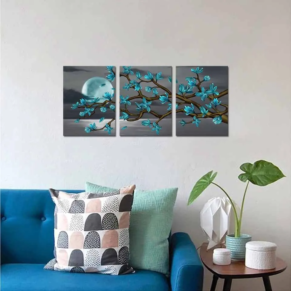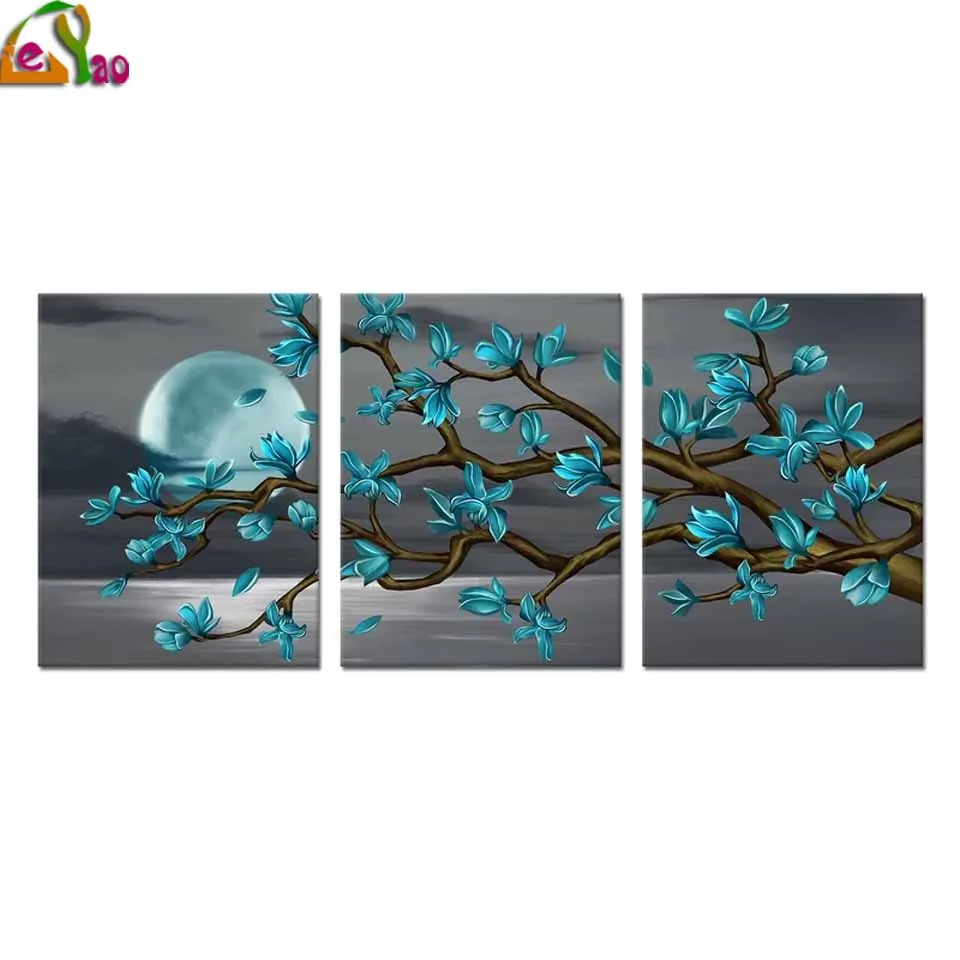 Картина с цветами и бриллиантами, красивые синие цветы, настенный художественный постер, 3 штуки, полная луна, алмазная вышивка, Современный домашний декор, картина