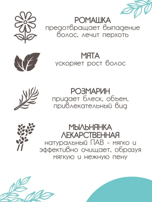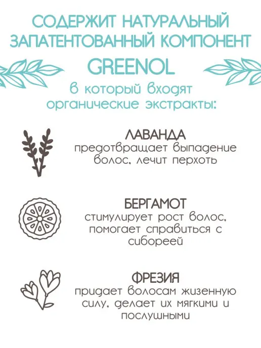 Лимонная кислота в составе кондиционера интенсивно очищает и оздоравливает волосы, обогащает их витаминами, заряжает энергией и жизненной силой. Лимонная кислота стимулирует кровообращение кожи головы, укрепляет волосяные луковицы и улучшает доступ кислорода к клеткам.Глицерин интенсивно увлажняет сухие волосы, смягчает и разглаживает их, устраняет перхоть и кожный зуд, ускоряет рост прядей, склеивает секущиеся кончики, предотвращает ломкость и выпадение.Мята перечная очищает, освежает и тонизирует кожу головы, нормализует уровень pH, устраняет излишнюю жирность, нормализует работу сальных желез, снимает зуд и раздражение.Кондиционер содержит экстракты лаванды, бергамота, фрезии, ромашки, розмарина и мыльнянки, которые в комплексе оздоравливают, восстанавливают и успокаивают волосы и кожу головы. Натуральные компоненты угнетают активность микробов, убивают себорейный грибок, устраняют неприятных запах и защищают волосы от преждевременного загрязнения.