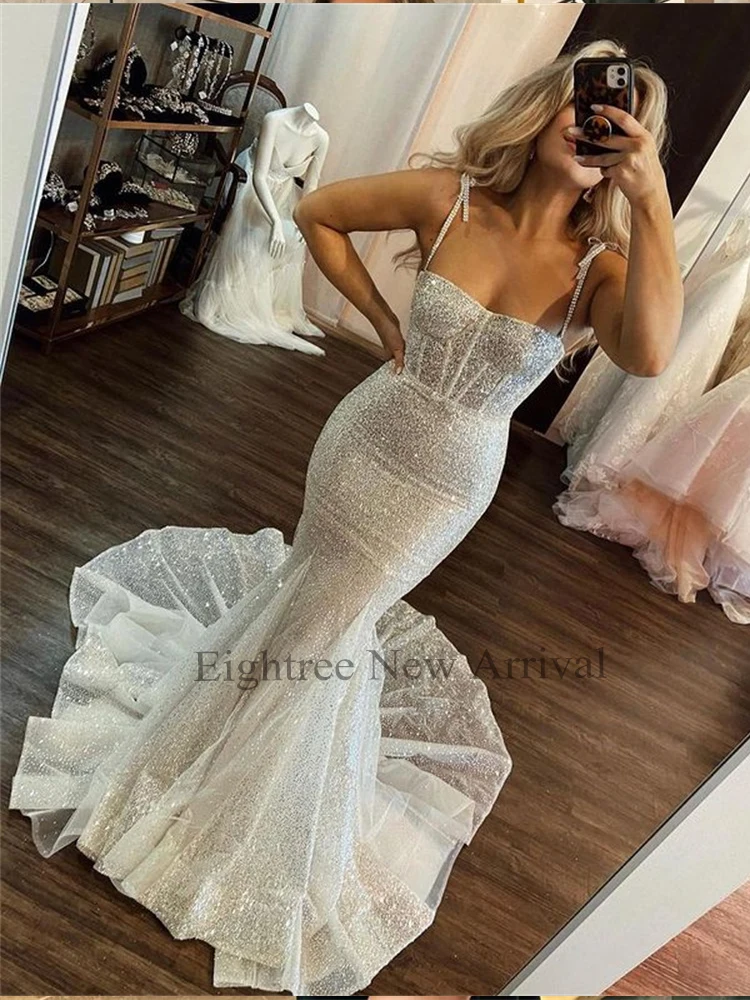 Длинные пляжные свадебные платья-русалки серебряного цвета на бретелях-спагетти с блестками шикарные плиссированные блестящие свадебные платья принцессы