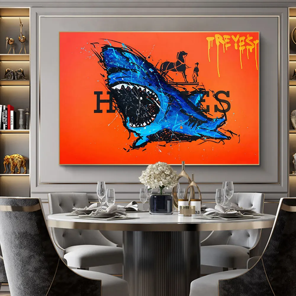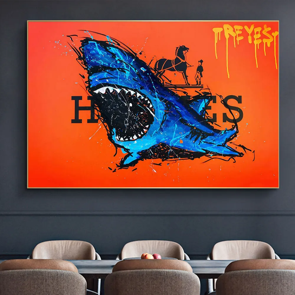 Абстрактная Роскошная Картина на холсте с изображением синей акулы, настенные картины с граффити для современной гостиной, украшение для дома