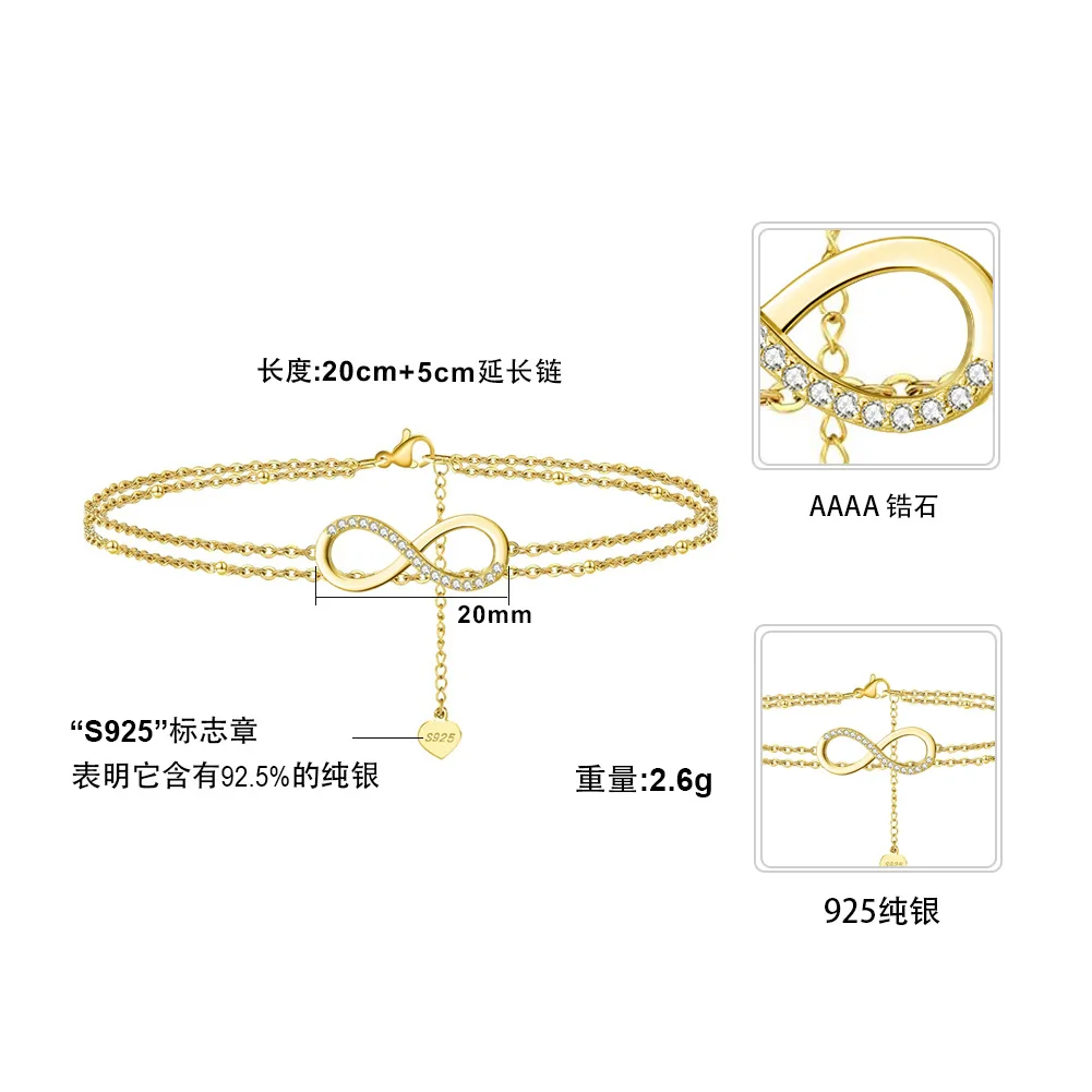 14K золото, аутентичное искусственное серебро, два ряда, бесконечный любовный узел CZ, цепочка на ногу, браслет, ювелирные изделия