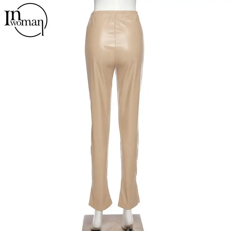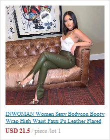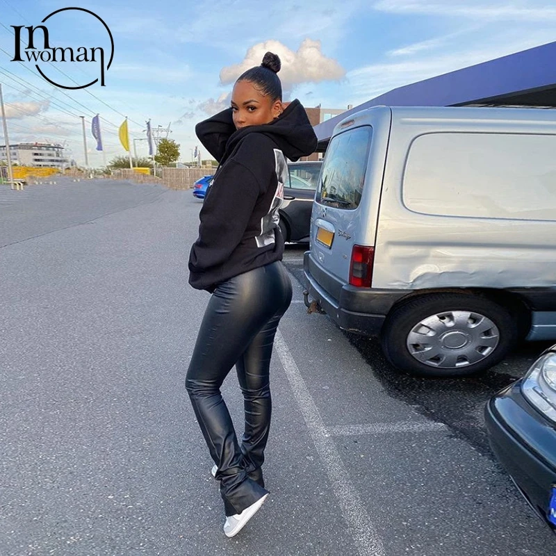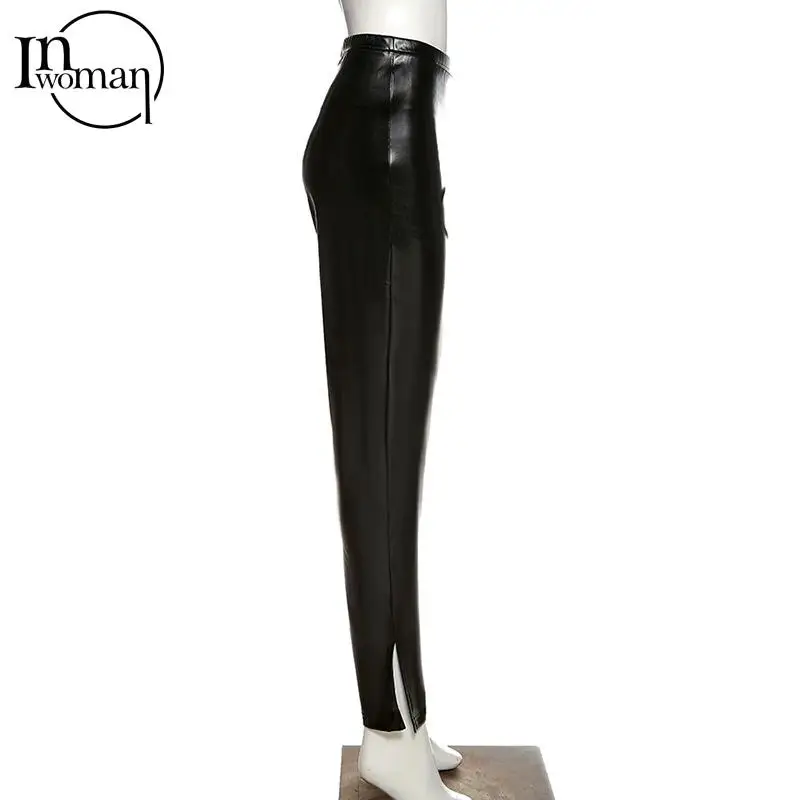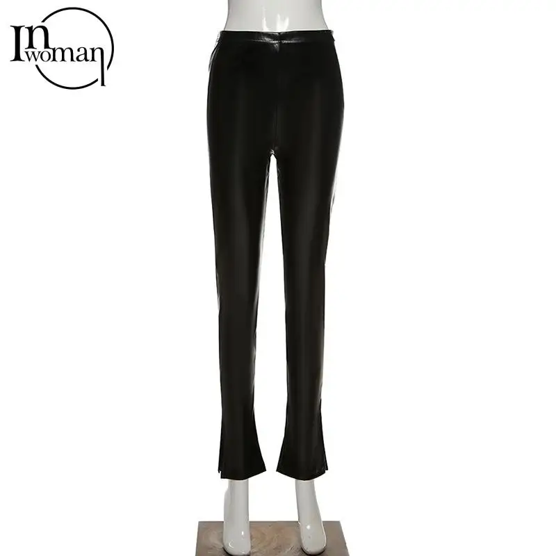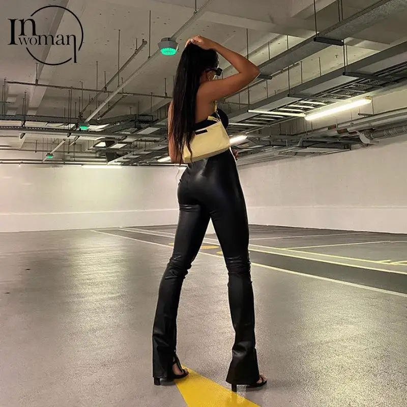 Женские облегающие брюки-клеш INWOMAN с высокой талией, из искусственной кожи, черные Клубные брюки для вечеринки на осень, 2021