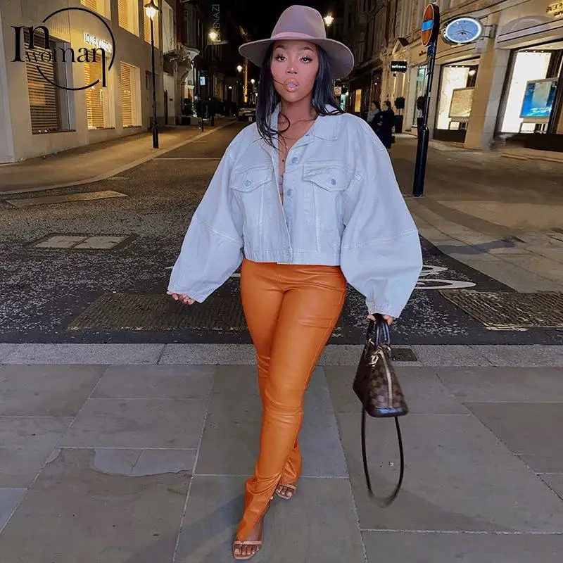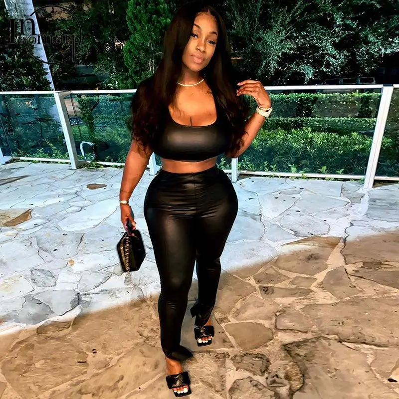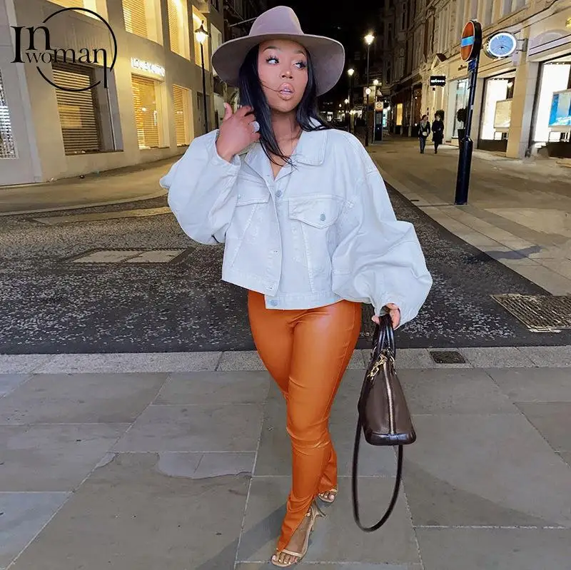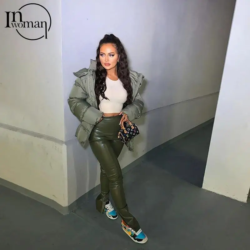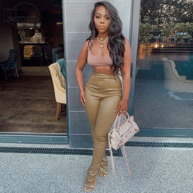 Женские облегающие брюки-клеш INWOMAN с высокой талией, из искусственной кожи, черные Клубные брюки для вечеринки на осень, 2021