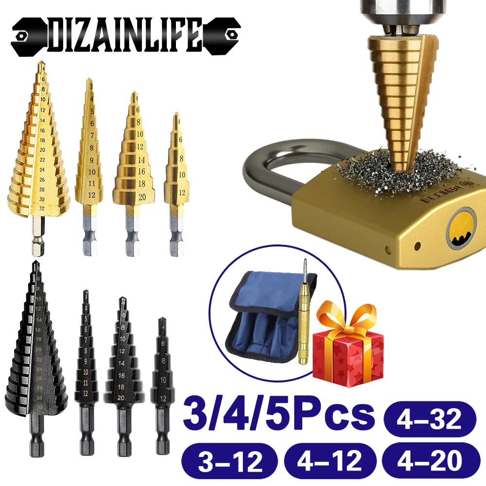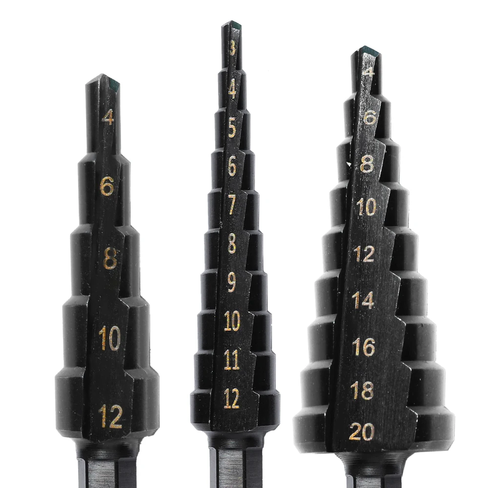 Это новая быстрорежущая сталь с большим шаговым Конусным сверлом, титановый набор сверл, который сделан из высококачественной быстрорежущей стали и с титановым покрытием, чтобы уменьшить трение и тепло