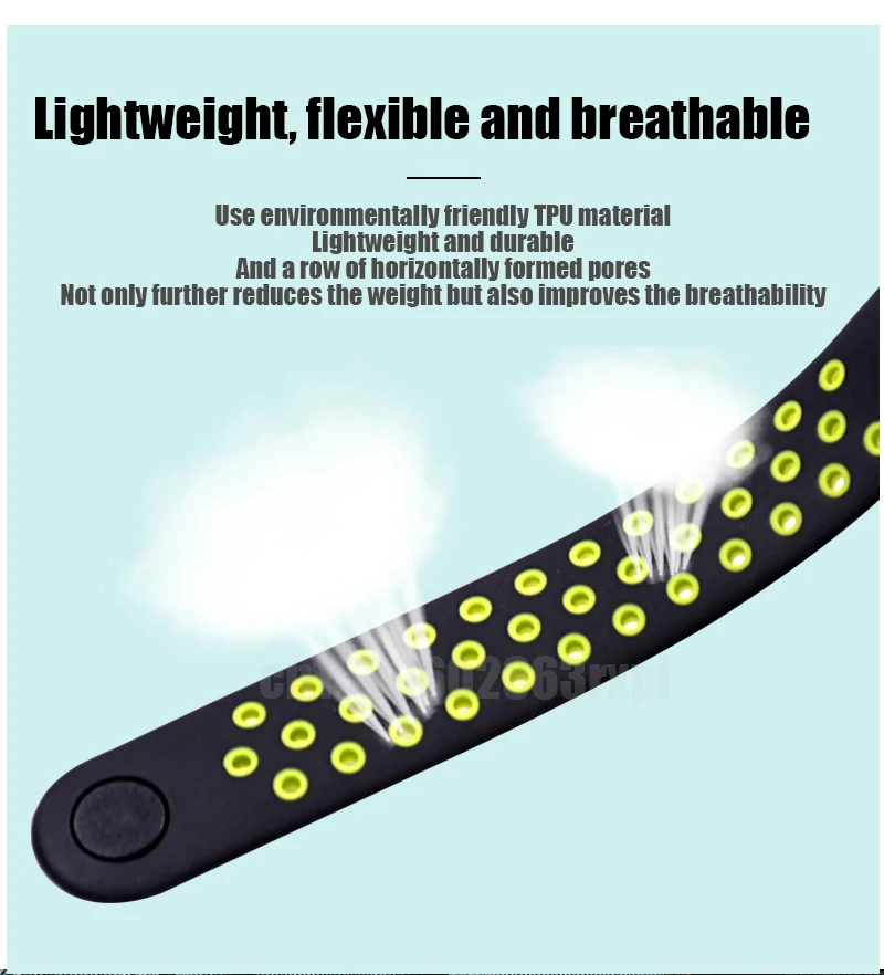 Использование мягкого и плотного термопластичного эластомера, отвечает экологическим требованиям, точно подобранный дизайн окружности запястья. Обеспечивает комфортное ношение