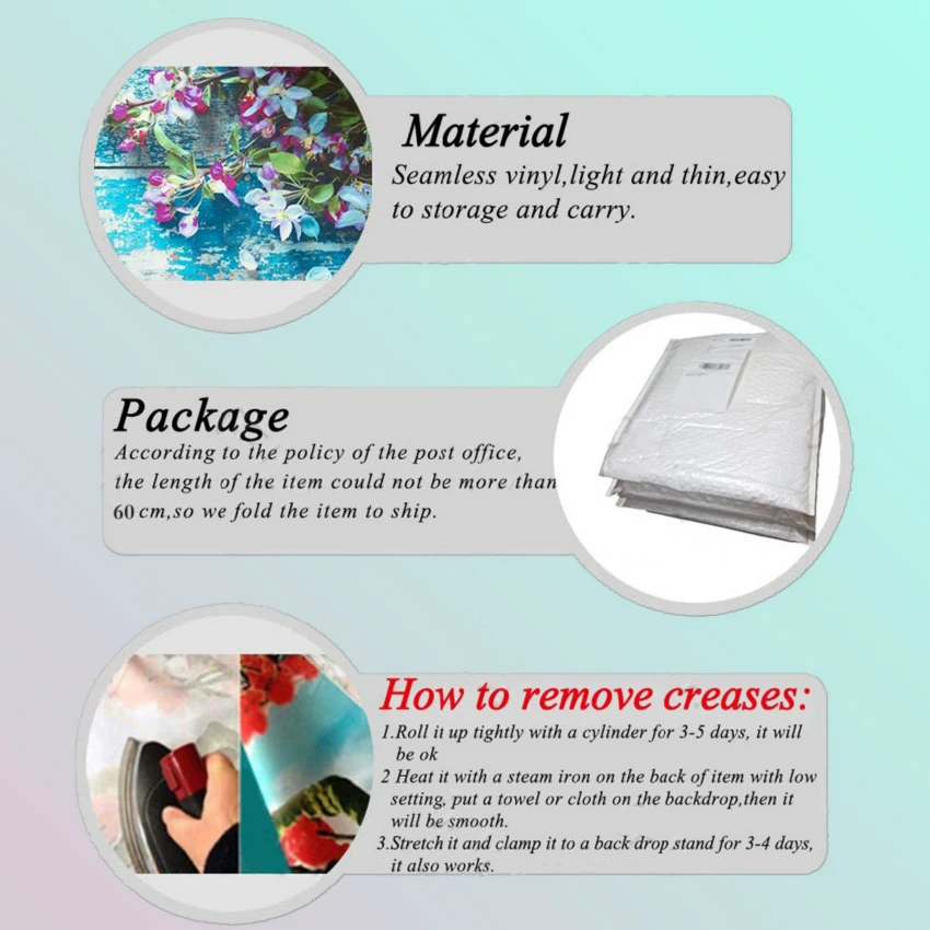 Все фоны будут отправлены в сложенном виде (из-за политики почтового отделения в отношении размера доставки). Если ваш задник пришел с небольшим сгибом, просто прогладьте заднюю сторону (не со стороны изображения), чтобы легко убрать морщины.
