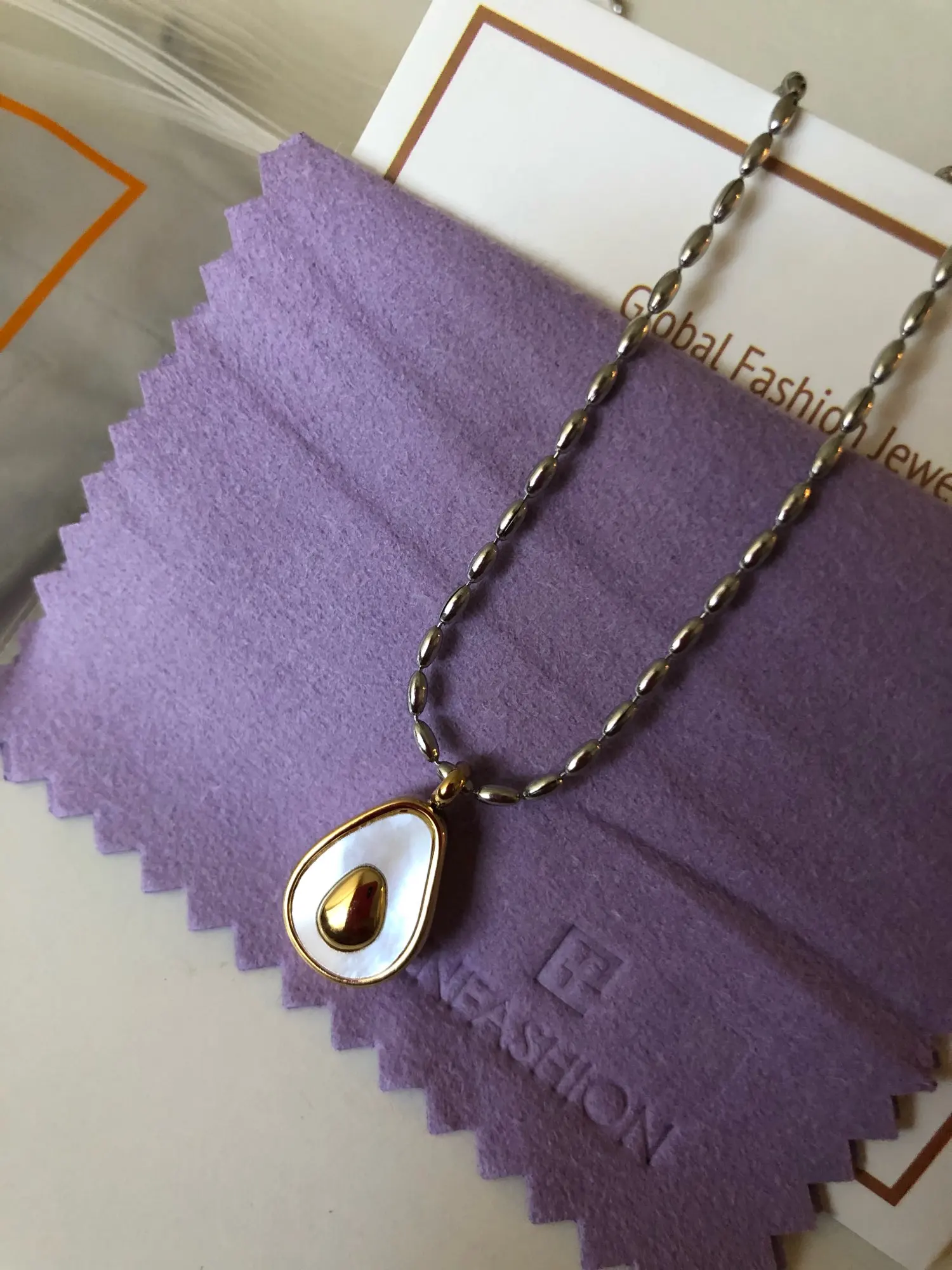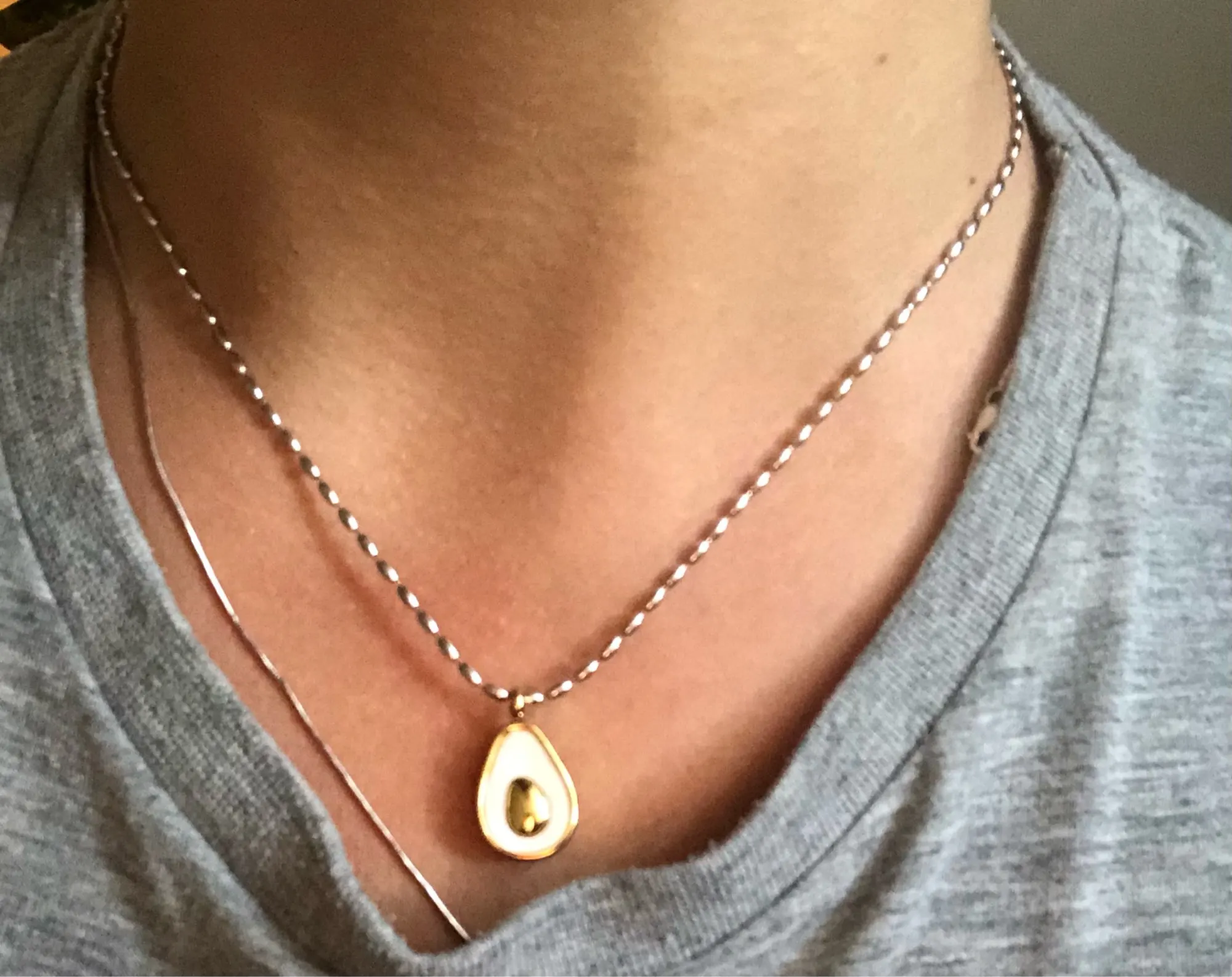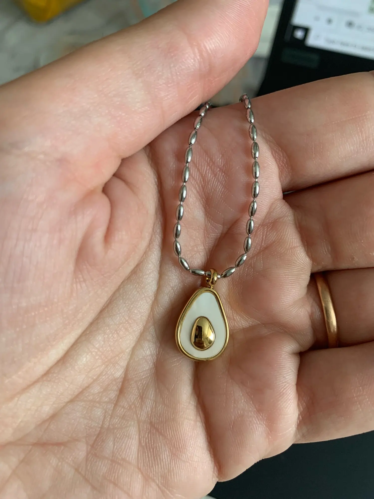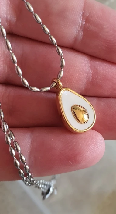 На 100% как на фото, тяжеленькое авокадо, красиво блестит, все отлично, даже слишком тщательно упаковано. Цепочка регулируется по длине. Смотрится супер.