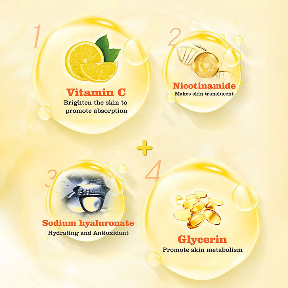 Название продукта: отбеливающая маска для лица с витамином С Подходящая кожа: подходит для нескольких типов Вес нетто: 25 мл./шт. Особенности: медицинская формула эффективно решает проблемы с лицом регулирует баланс влаги и масла кожи, повышает ее эластичность, предотвращает старение и УФ и способствует нежной и гладкой коже.