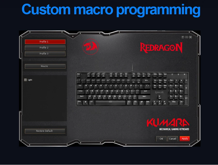 Цвета радуги, RGB, 5 различных режимов освещения, 5 уровней яркости подсветки, скорость дыхания, программируемая подсветка RGB.