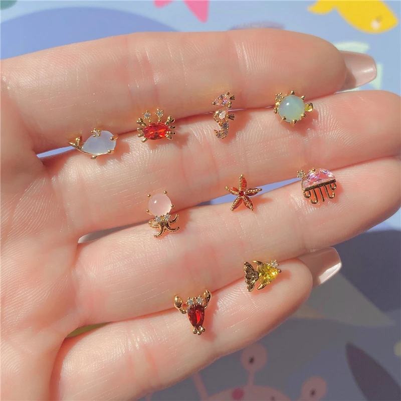 Милые серьги-гвоздики с морской жизнью, красочные Кристальные стразы, креветки, краб, морская звезда, пирсинг, ушные гвоздики, пляжные украшения, 1 шт.