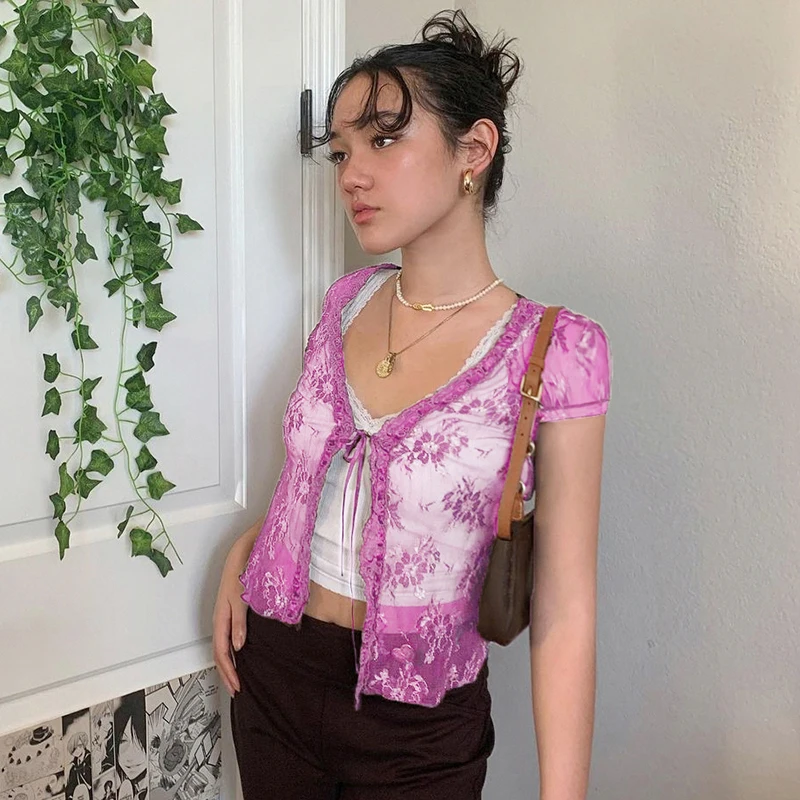 Коричневый Винтажный кружевной кроп-топ Y2K с коротким рукавом, прозрачные сексуальные сетчатые женские футболки 2021, с V-образным вырезом, на шнуровке, с цветочным принтом, кавайная одежда, новинка