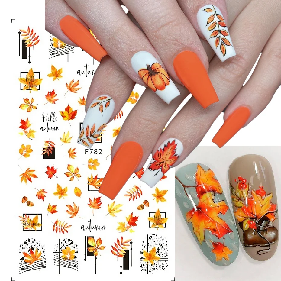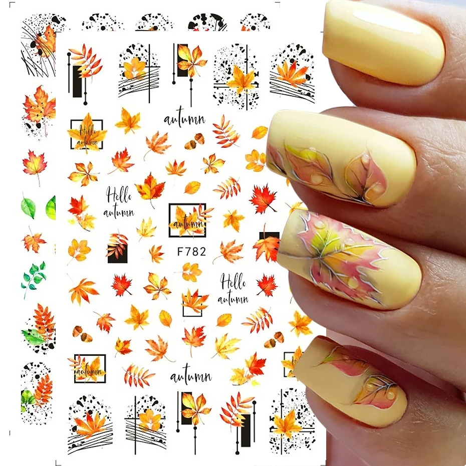 Осенние наклейки для дизайна ногтей с кленовыми листьями, Золотой лист, Осенние дизайны, наклейки для ногтей, слайдеры, украшения, 3D клей для маникюра, TRF782-791