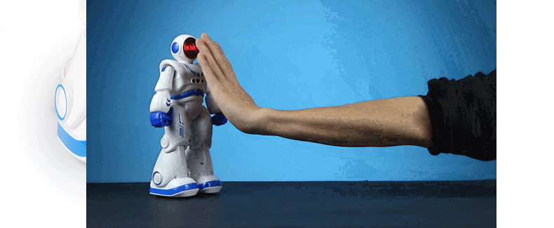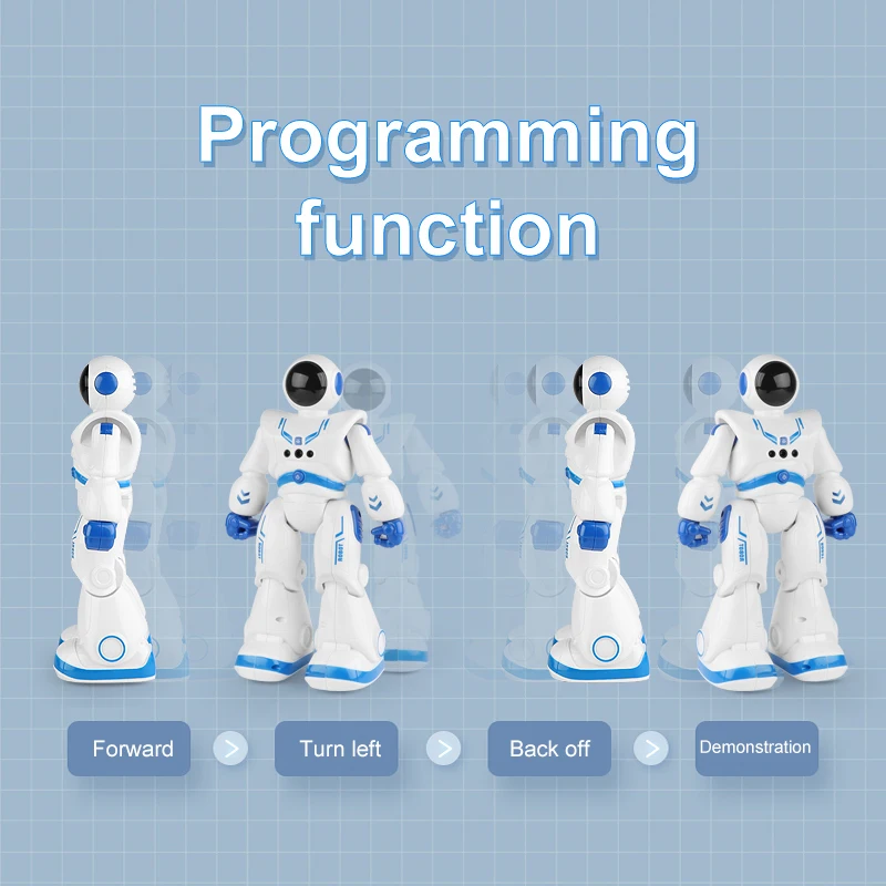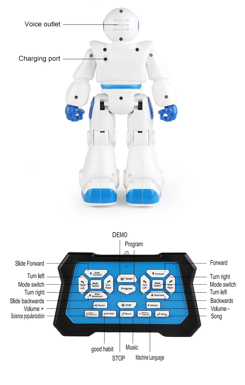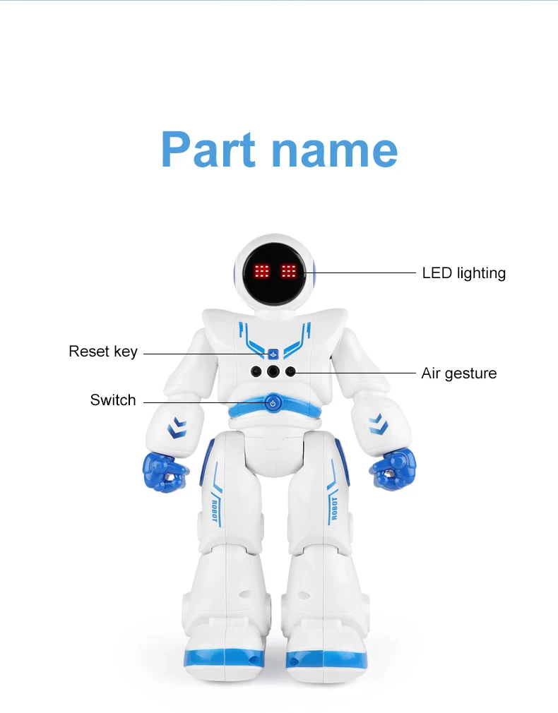 Особенности: 1. Вручную Отрегулируйте форму: вы можете настроить ее под свою любимую осанку самостоятельно. 2. Распознавание жестов: с помощью жестов вы можете управлять роботом, чтобы двигаться вперед, назад, повернуть налево и повернуть направо. При выполнении каждого действия, он более динамичный со звуковыми эффектами. 3. Пульт дистанционного управления: робот может управляться, чтобы ходить с помощью пульта дистанционного управления. 4. Автоматическая Демонстрация: воспроизведение музыки и движение вперед, поворот влево и вправо случайным образом. 5. Функция обучения: Позвольте детям научиться популярным наукам и хорошим привычкам в жизни. 6. Программирование действий: вы можете программировать направление ходьбы в соответствии с вашими предпочтениями. Описание: 1. Маленькие Мальчики обязательно будут поражены навыками этого робота RC и наслаждаться в помещении и на открытом воздухе. 2. R18 RC Robot-отличный подарок для мальчиков и девочек. Его гибкая работа и высококачественный материал не дают родителям беспокоиться и заставляют детей наслаждаться хорошей игрой. Характеристики: Номер товара: R18 Конфигурация продукта: Датчик жестов Материал изделия: ABS аппаратная Электроника Размер изделия: 16*8,5*27 см Время зарядки: около 90 минут Время использования: около 90 минут Режим дистанционного управления: инфракрасный датчик, датчик жестов Расстояние дистанционного управления: 6 м Батареи дистанционного управления: 2 * AAA батареи (не входят в комплект) Можно ли перемещать суставы: Да Вес изделия: 374 г Общий вес: 610 г Возраст: 8 + Цвет: серебристый Корпус аккумулятора: 3,7 V 500 мА · ч (входит в комплект) Посылка включает в себя: R18 робот * 1 Пульт дистанционного управления * 1 Usb-кабель для зарядки * 1