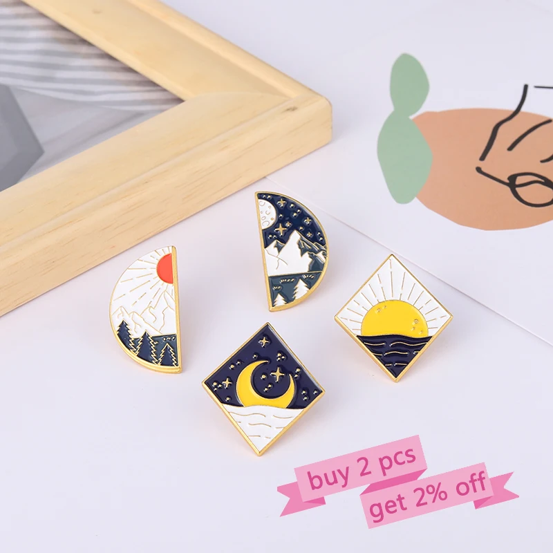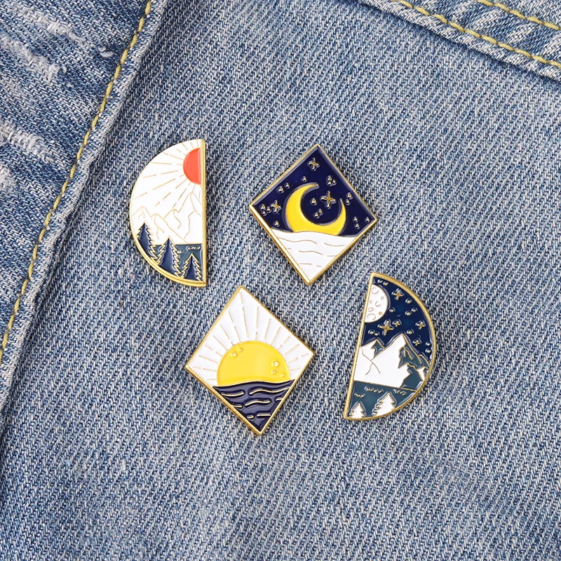Эмалированные булавки с изображением Солнца и Луны Пейзажа для пар, брошь для дня и ночи, значок на лацкан, уличная бижутерия для кемпинга, подарок для детей, друзей