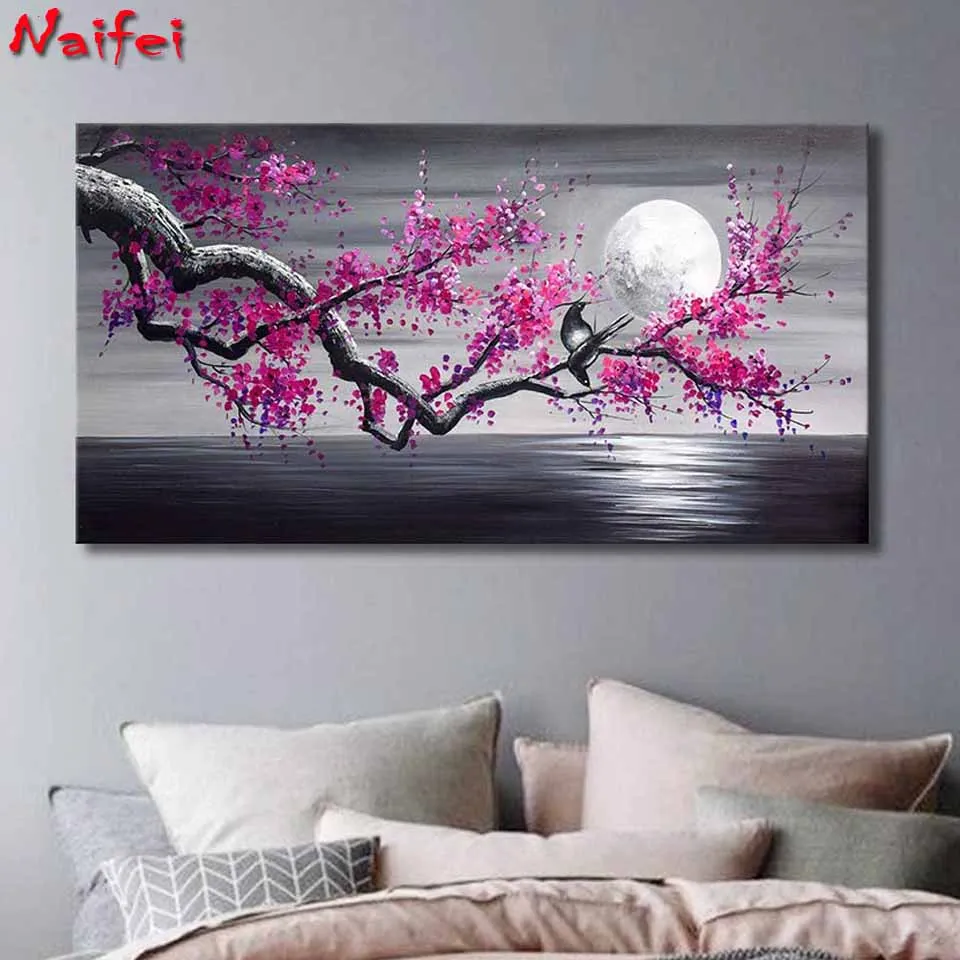 Цветок сливы Дерево полная луна фиолетовый цветок 5d Diy Алмазная картина большая Галерея обернутый черный и белый цветочный пейзаж