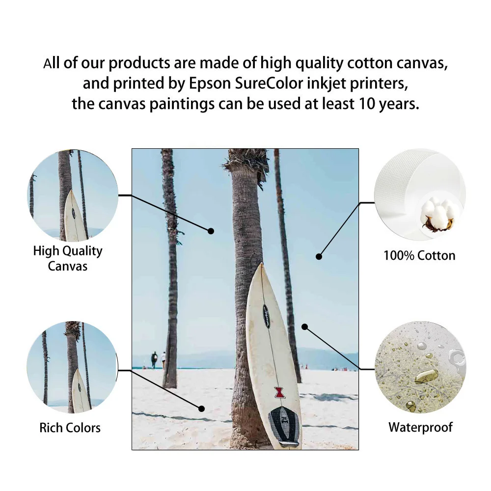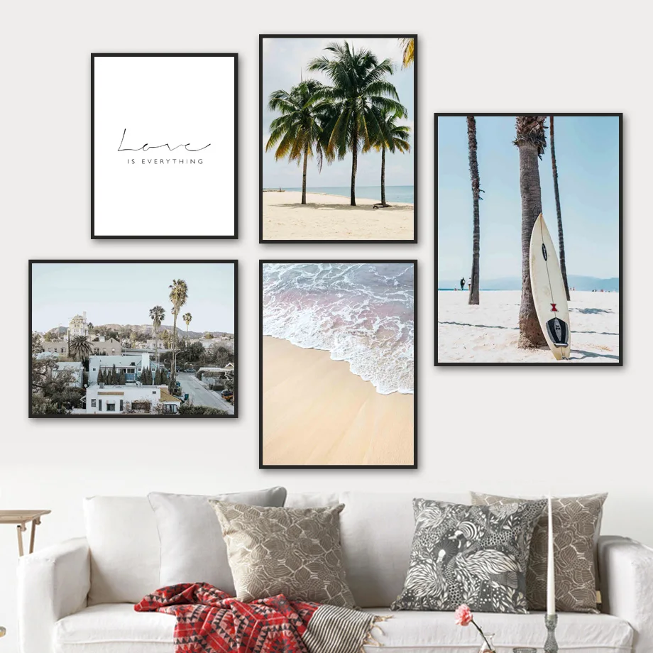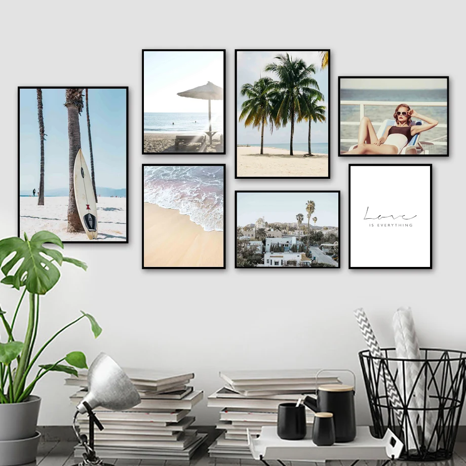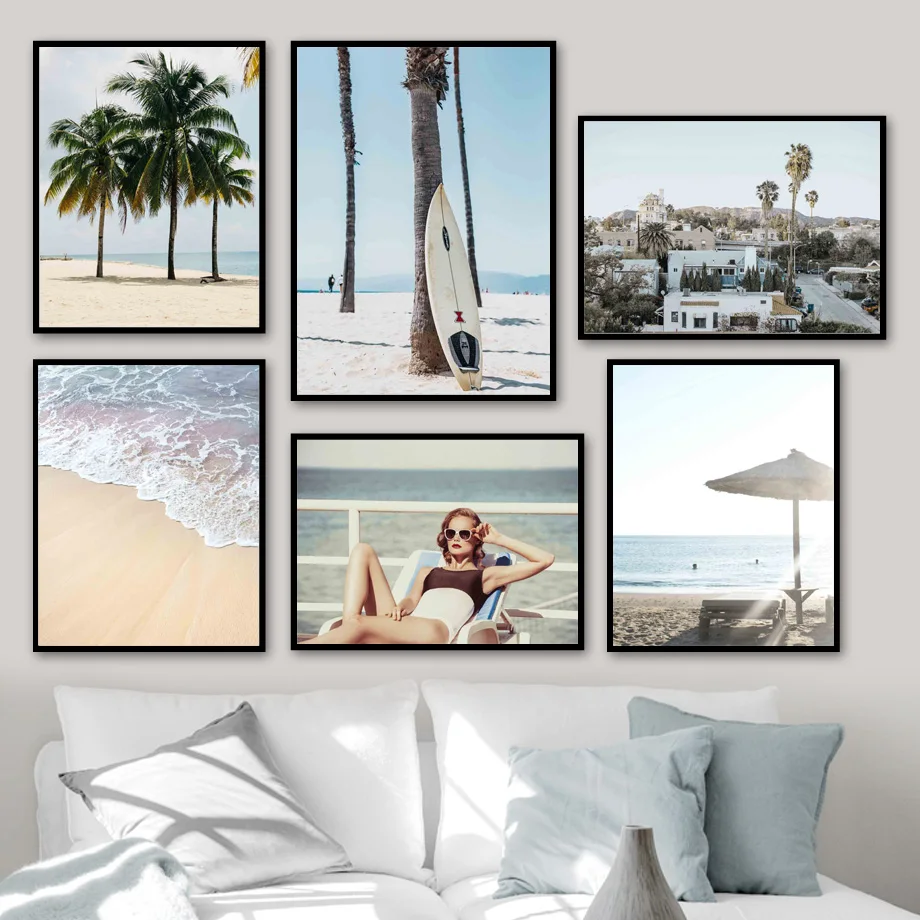 Морской пляж, кокосовое дерево, доска для серфинга, настенная Картина на холсте, скандинавские плакаты и принты, настенные картины для декора гостиной