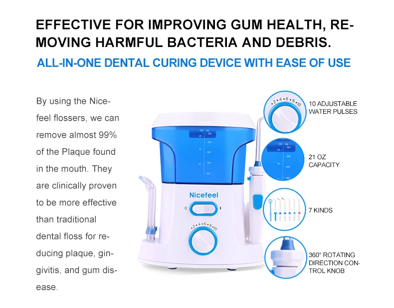 Эффективно для улучшения здоровья десен, повторного перемещения вредных бактерий и мусора.Все-в-одном денталледирующее устройство с простотой использованияС помощью нитей Nicefeel мы можем удалить почти 99% налета, обнаруженного во рту.Клинически доказано, что они более эффективны, чем традиционные зубные нити для повторного налета, гингивита и десен.10 регулируемых импульсов воды