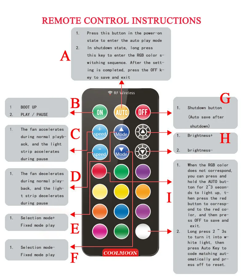 Способ работы:А.1. Нажмите эту кнопку, чтобы войти в режим воспроизведения (при включении)2. Нажмите и удерживайте кнопку, чтобы перейти к последовательности переключения цветов RGB. Нажмите, чтобы сохранить и выйти после установки (в выключенном состоянии)B.1. Включите2. Пауза воспроизведения3. Нажмите S, чтобы включить светильник в режим ускорения полосы. Нажмите S-чтобы включить светильник в режим замедления полосы (когда воспроизведение приостановлено)C.1. Вентилятор ускоряет работу. (Во время нормального воспроизведения)2. Светильник увеличивает скорость (когда воспроизведение приостановлено) (сначала нажмите)D.1. Скорость вращения вентилятора снижается. (Во время нормального воспроизведения)2. Светильник со скоростью вниз (когда воспроизведение приостановлено) (сначала нажмите)Е.Рекомендуемый режим + (воспроизведение в фиксированном режиме)F.Рекомендуемый режим-(воспроизведение в фиксированном режиме)G.Кнопка выключения (Автоматическое сохранение после выключения)HЯркость +Яркость-IЕсли цвета RGB не совпадают, кнопка кнопки «Авто» включит светильник после нажатия кнопки в течение 2-3 секунд. Затем нажмите красную кнопку и цвет будет красным. Затем нажмите, чтобы сохранить и выйти, соответствующий будет правильным после перезапускаНажмите и удерживайте кнопку в течение 2-3 секунд во время включения питания. Светильник с белой кнопкой станет белым. Затем снова нажмите кнопку Auto. Он будет сопряжен автоматически. Восстановление исходного кода после отключения питания